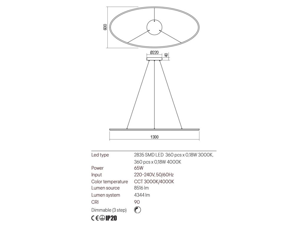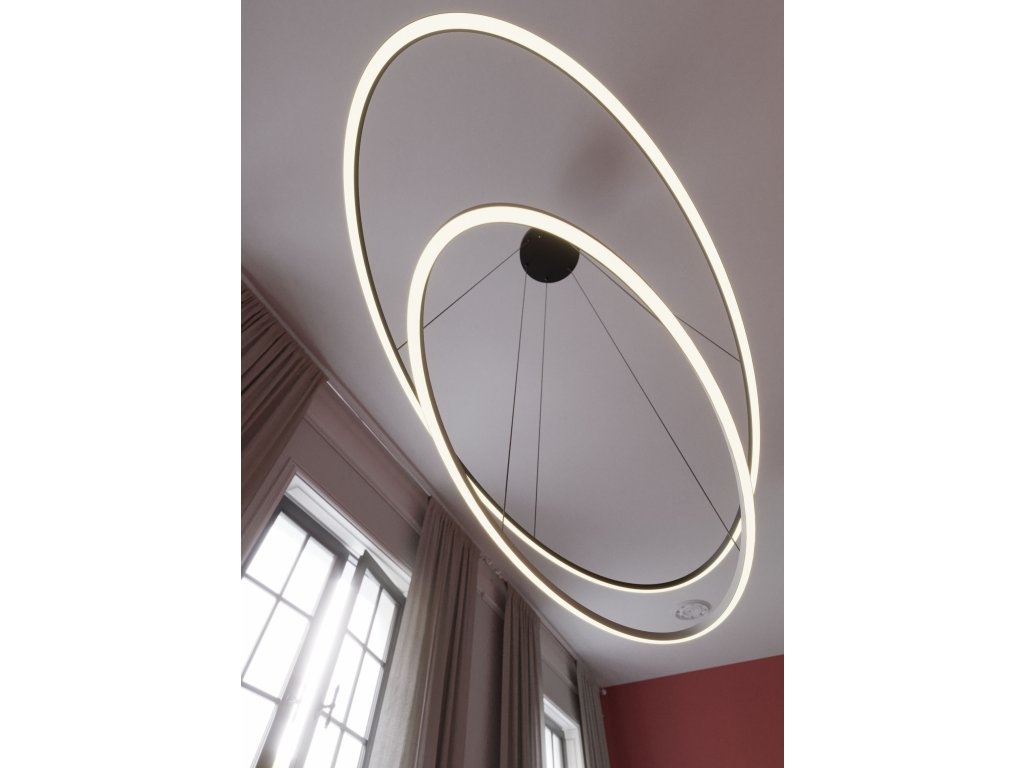 Závesné interiérové svietidlo vybavené LED diódami SMD s možnosťou voľby teploty farby svetla. Hliníková a kovová konštrukcia lakovaná v troch farebných variantoch s matne bielym PVC difúzorom.