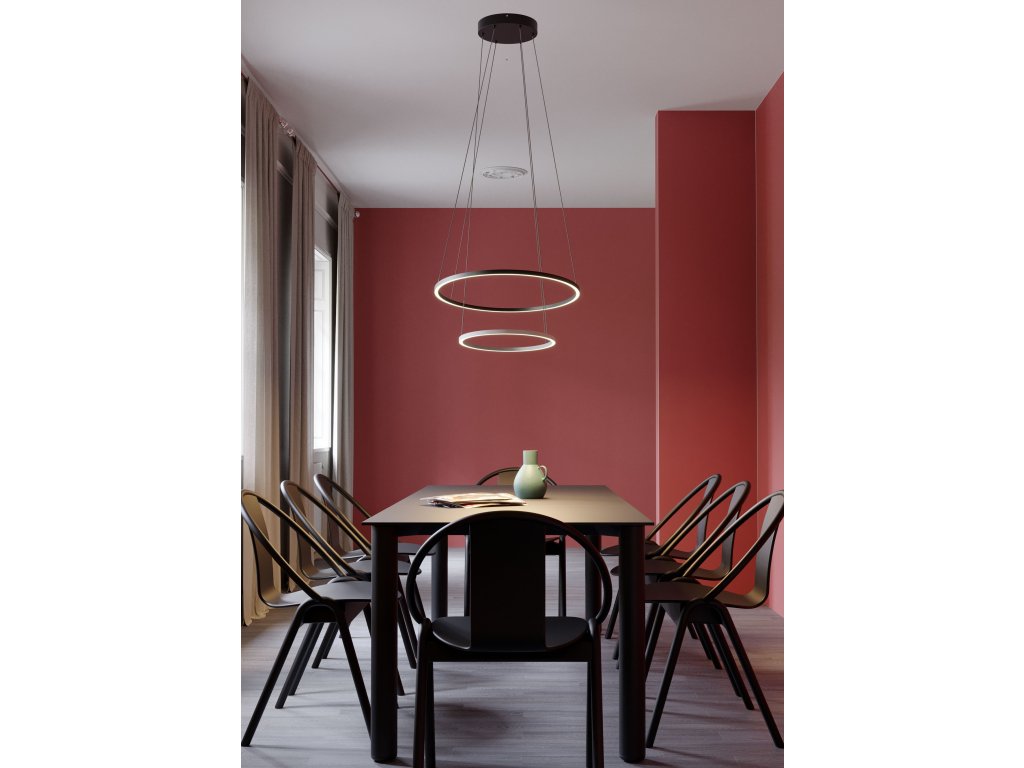 Závesné interiérové svietidlo vybavené LED diódami SMD s možnosťou voľby teploty farby svetla. Hliníková a kovová konštrukcia lakovaná v troch farebných variantoch s matným bielym PVC difúzorom.