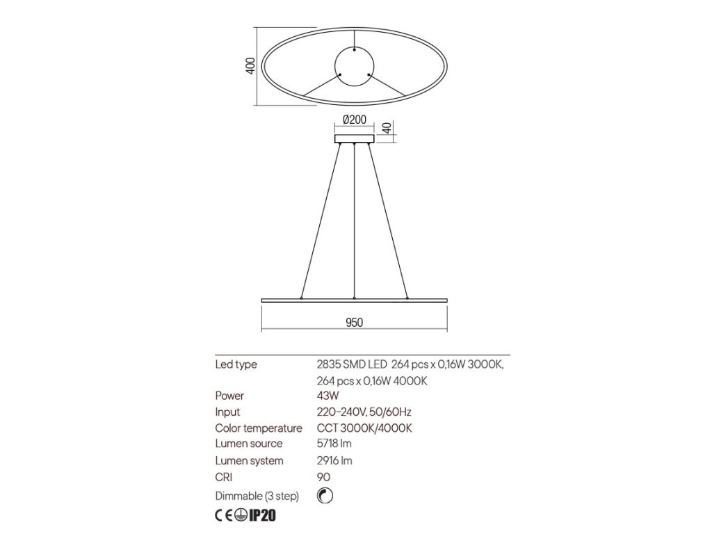 Závesné interiérové svietidlo vybavené LED diódami SMD s možnosťou voľby teploty farby svetla. Hliníková a kovová konštrukcia lakovaná v troch farebných variantoch s matne bielym PVC difúzorom.