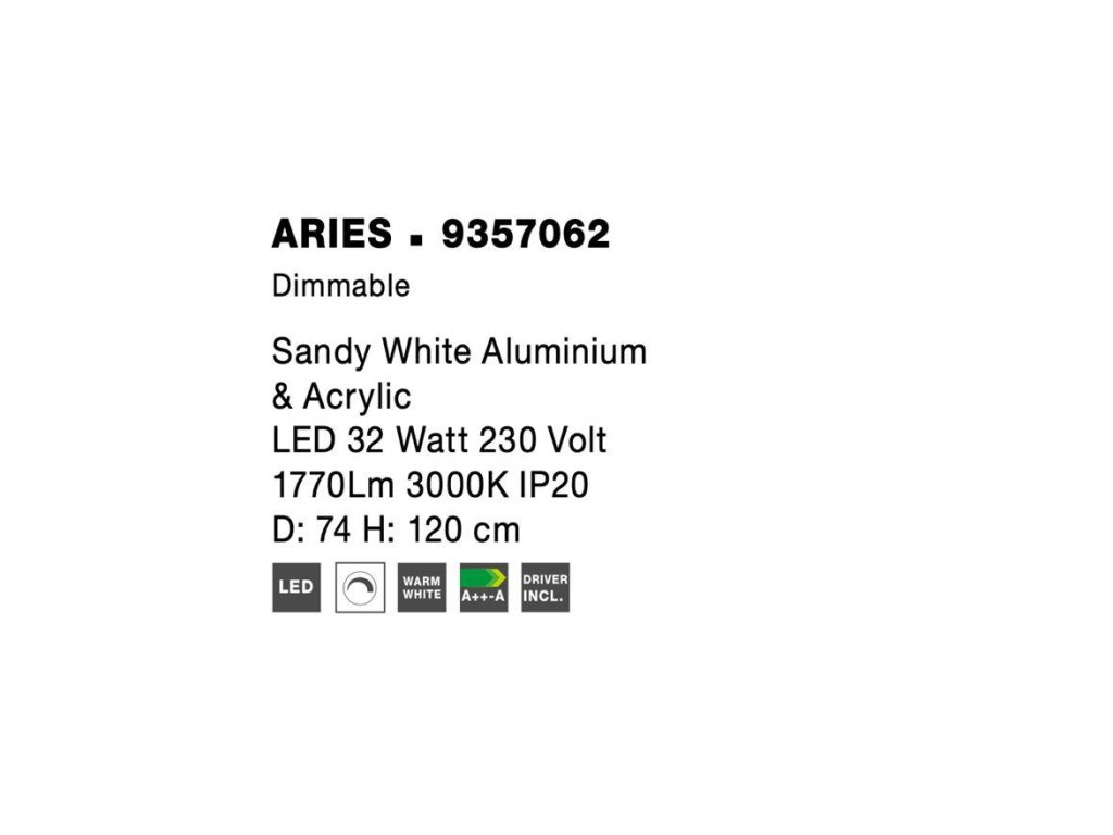 Závesné svietidlo ARIES, 32W je k dispozícii v bielej a čiernej farbe. Svietidlo je vyrobené z hliníka a akrylu. Rozmery svietidla sú 74x120 cm. Integrovaný LED zdroj vydáva teplé biele svetlo (3000K). Svietivosť zdroja je 1770 lúmenov a je stmievateľný systémom TRIAC. Svietidlo odporúčame nad jedálenský stôl, do obývacej izby alebo spálne.