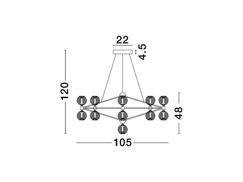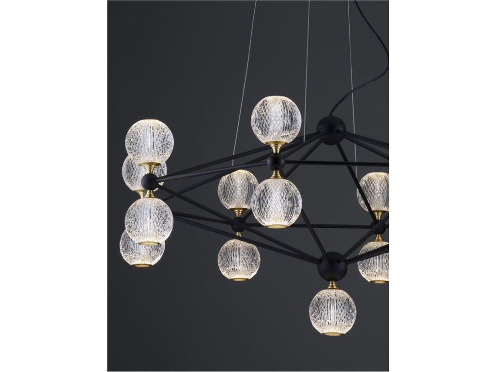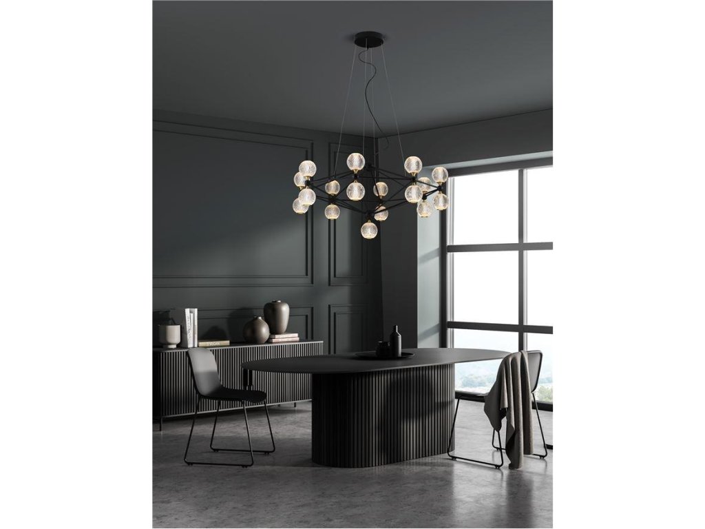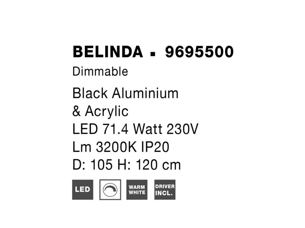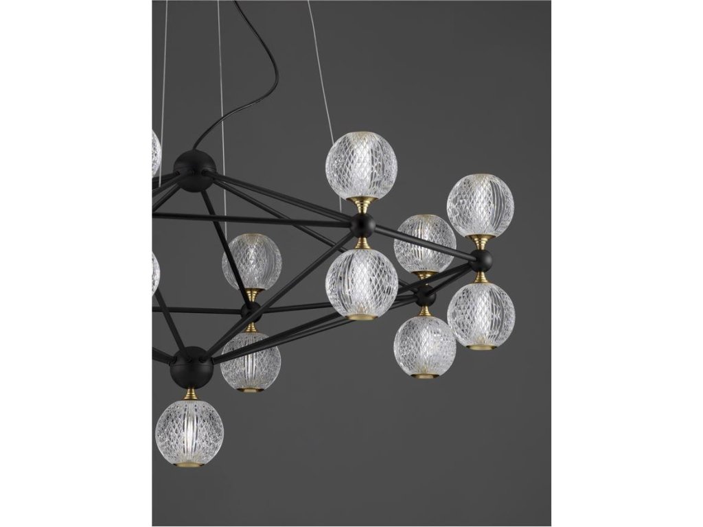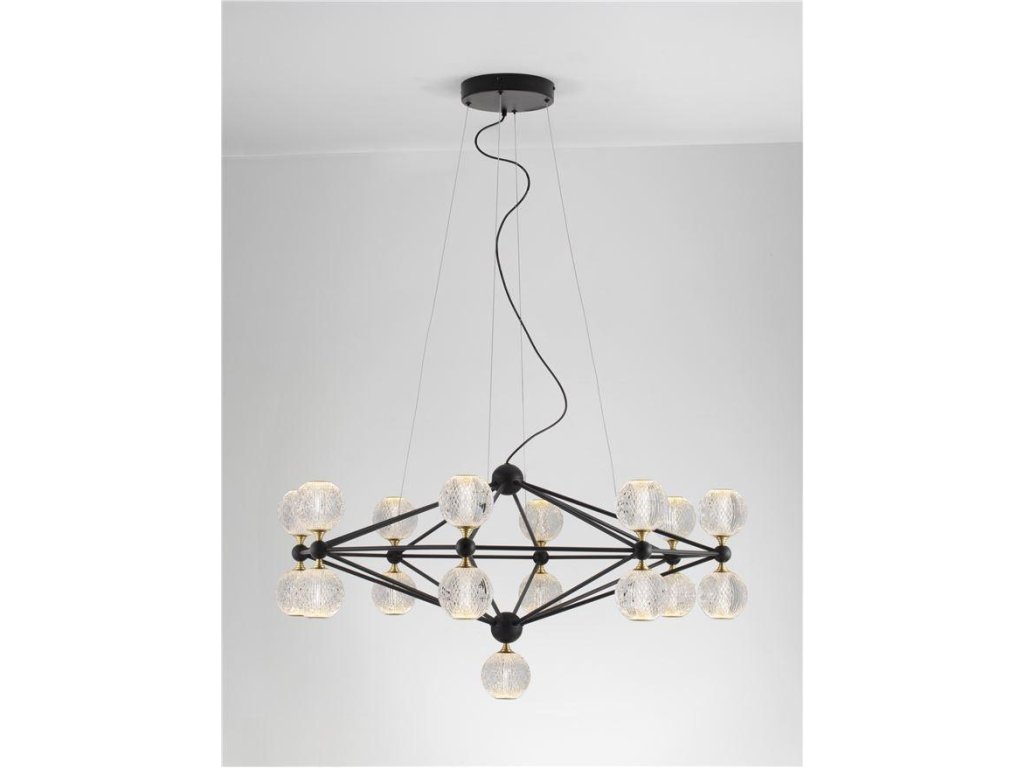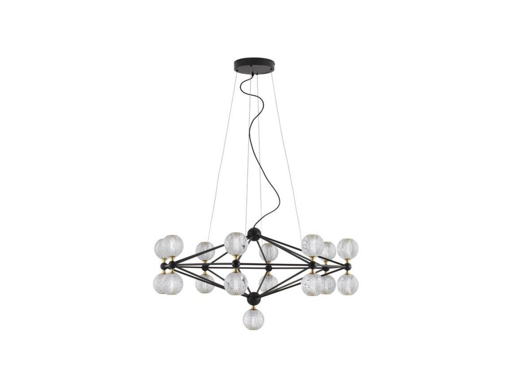 Závesné svietidlo BELINDA, 78W je k dispozícii v čiernej farbe. Svietidlo je vyrobené z kovu a akrylu. Rozmery svietidla sú 105x120 cm. Integrovaný LED zdroj vydáva teplé biele svetlo (3200K) a je stmievateľný systémom TRIAC. Svietidlo odporúčame nad jedálenský stôl, do obývacej izby alebo spálne.
