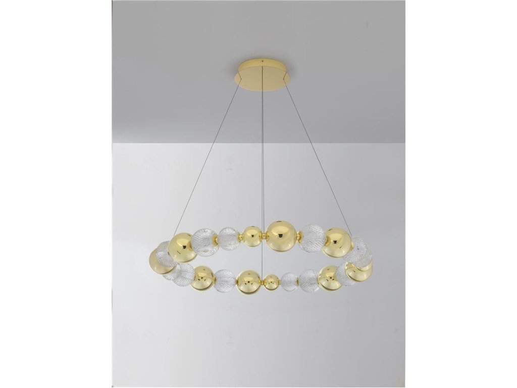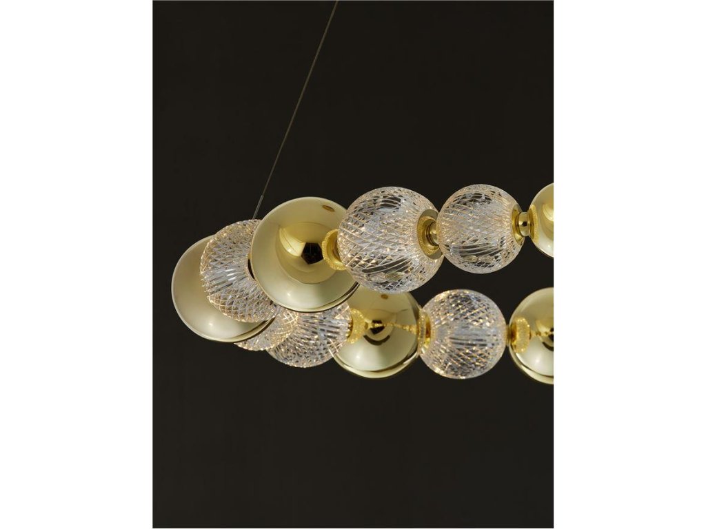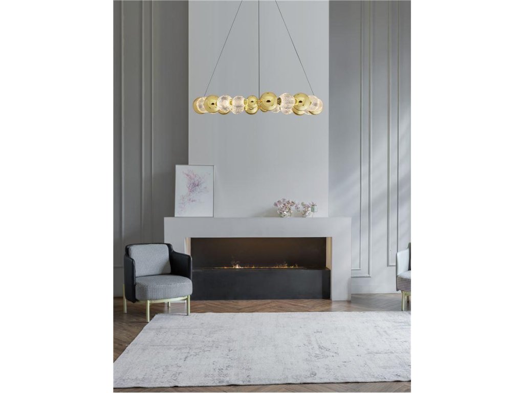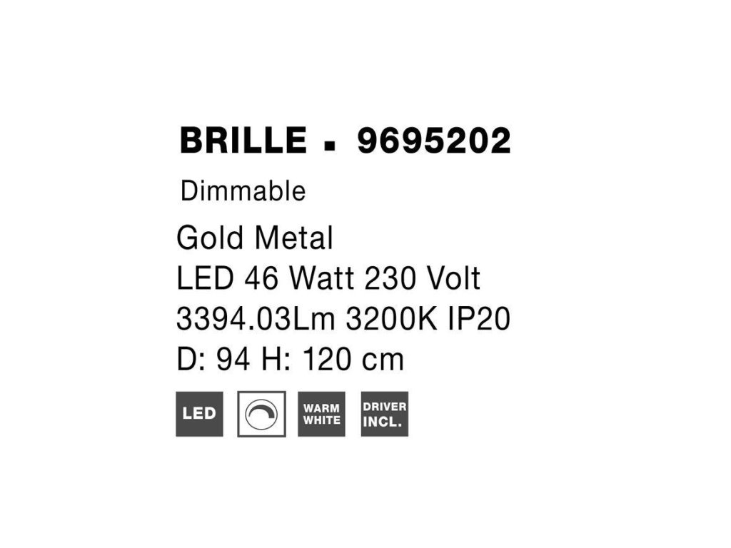 Závesné svietidlo BRILLE, 46W je k dispozícii zlatom prevedení. Svietidlo je vyrobené z hliníka a skla. Rozmery svietidla sú 94x120 cm. Integrovaný LED zdroj vydáva teplé biele svetlo (3200K). Svietivosť zdroja je 3394 lúmenov a je stmievateľný systémom TRIAC. Svietidlo odporúčame nad jedálenský stôl alebo do obývačky.