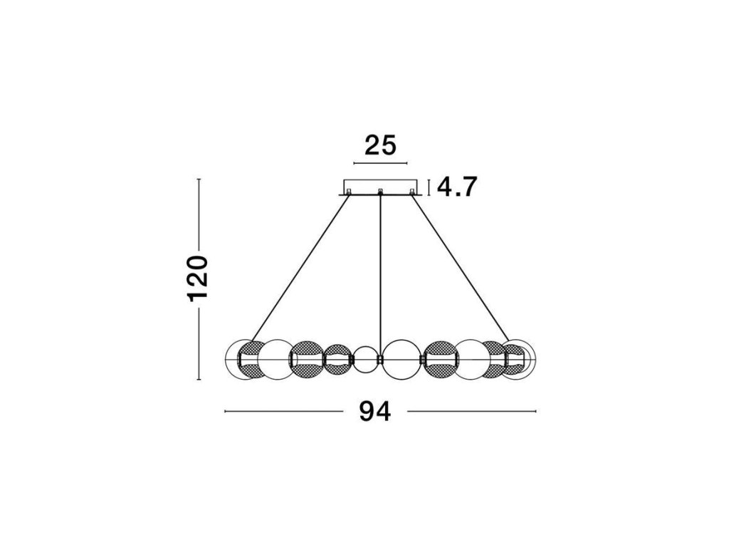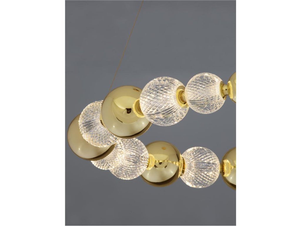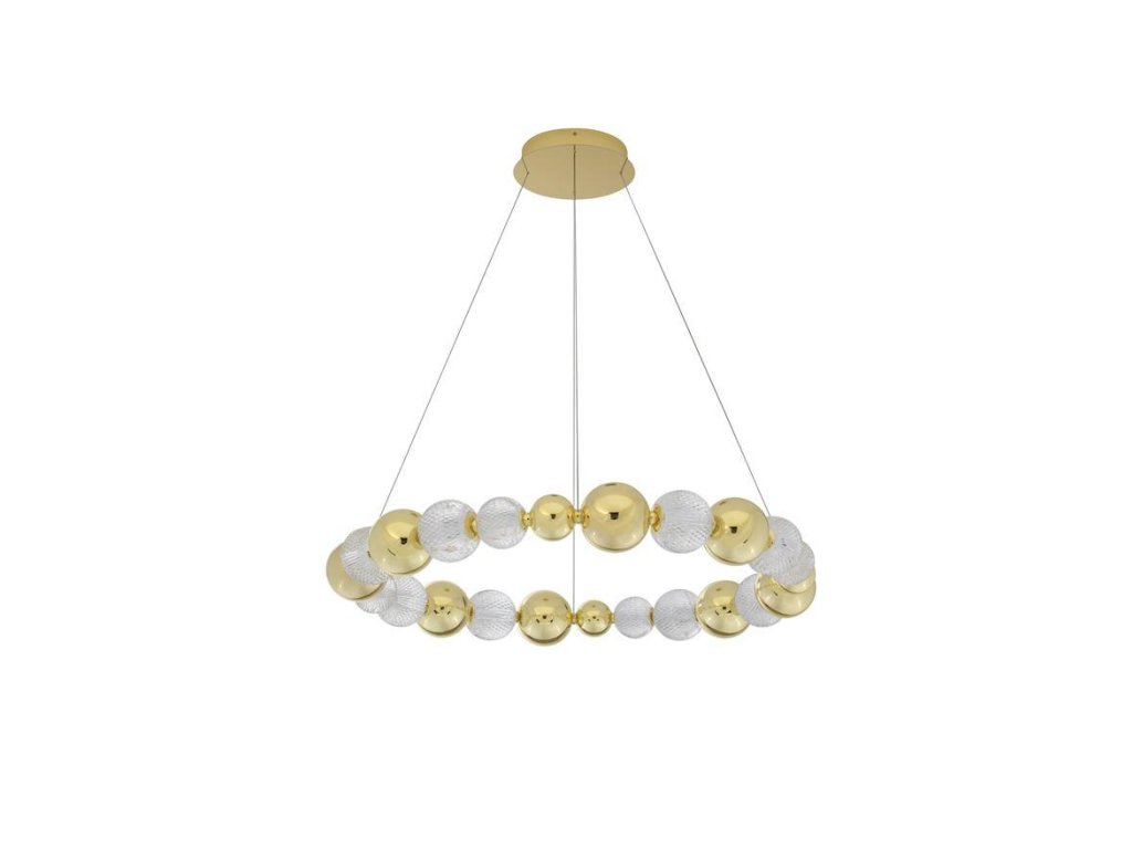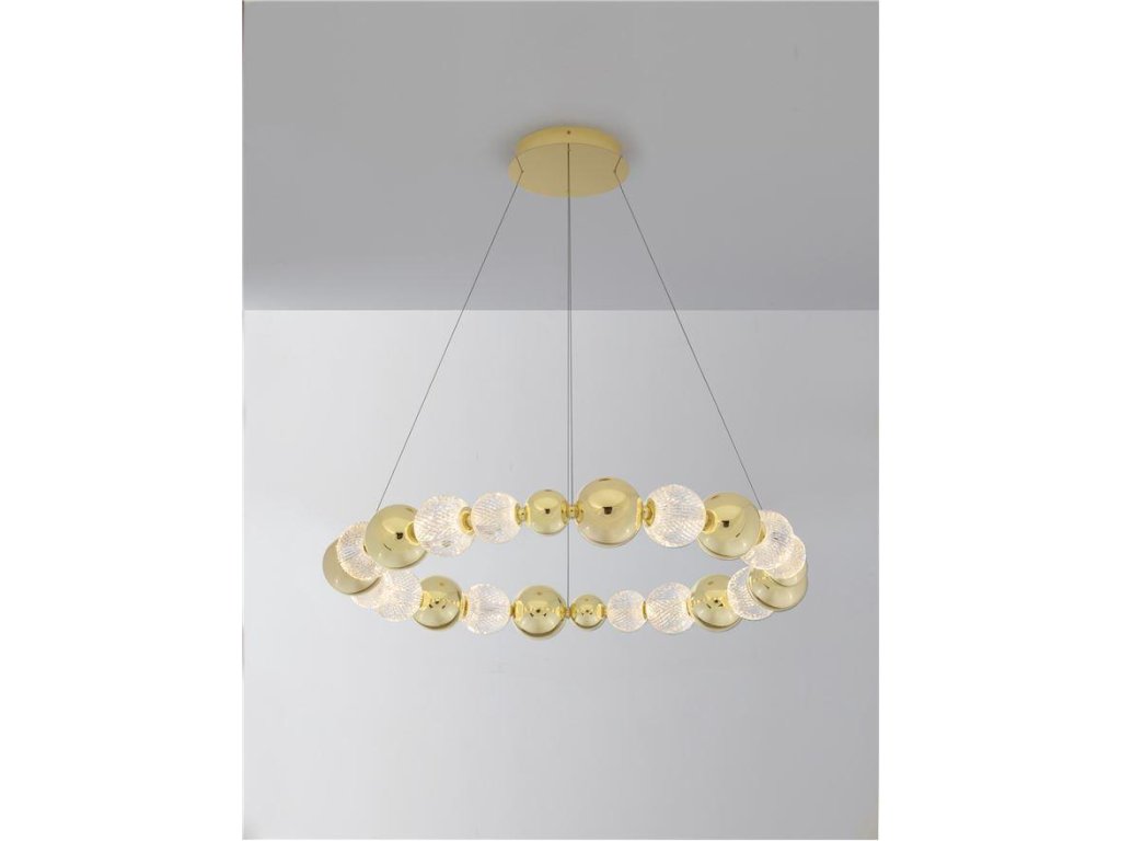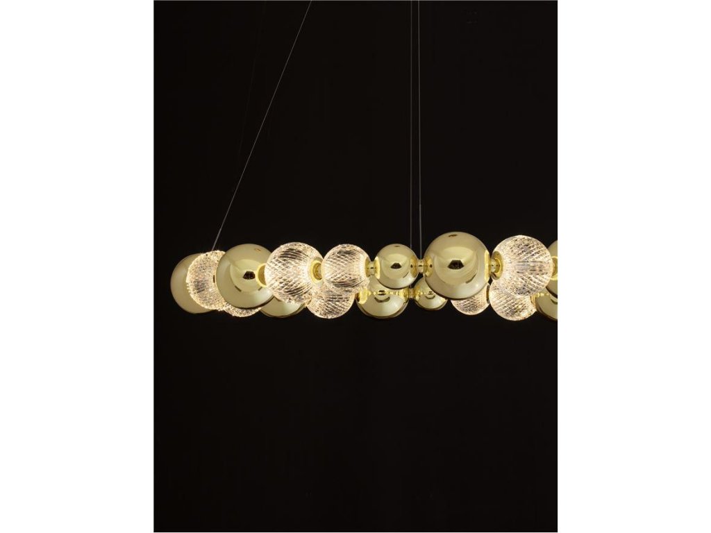 Závesné svietidlo BRILLE, 46W je k dispozícii zlatom prevedení. Svietidlo je vyrobené z hliníka a skla. Rozmery svietidla sú 94x120 cm. Integrovaný LED zdroj vydáva teplé biele svetlo (3200K). Svietivosť zdroja je 3394 lúmenov a je stmievateľný systémom TRIAC. Svietidlo odporúčame nad jedálenský stôl alebo do obývačky.