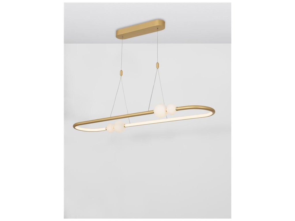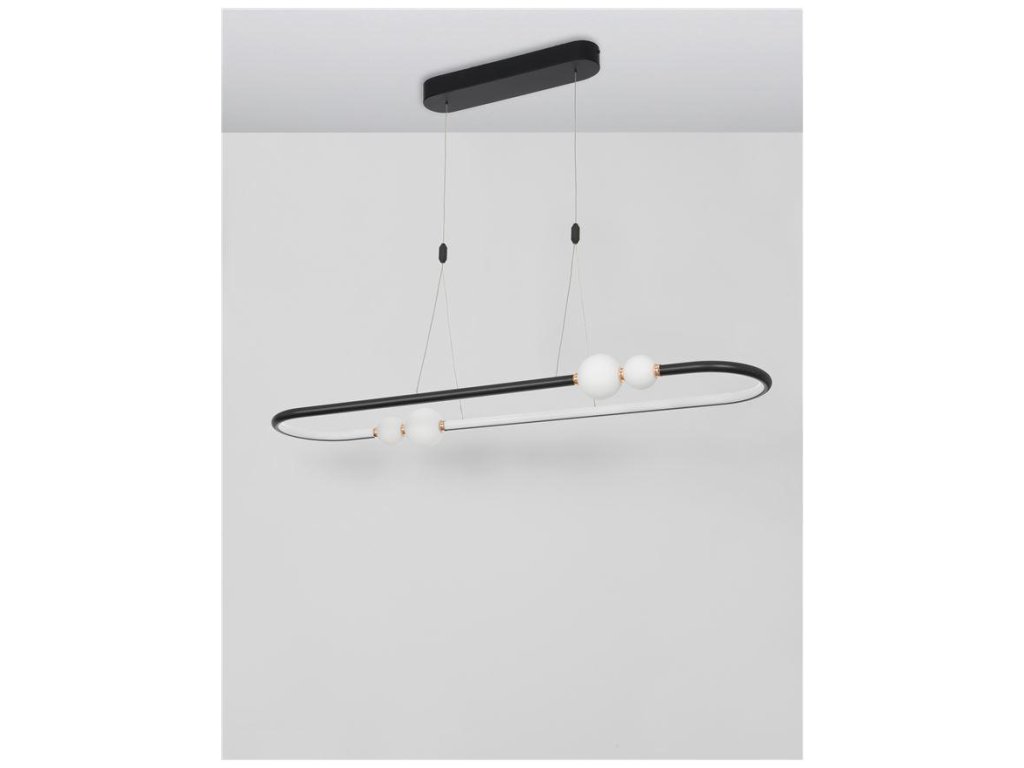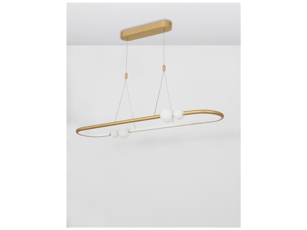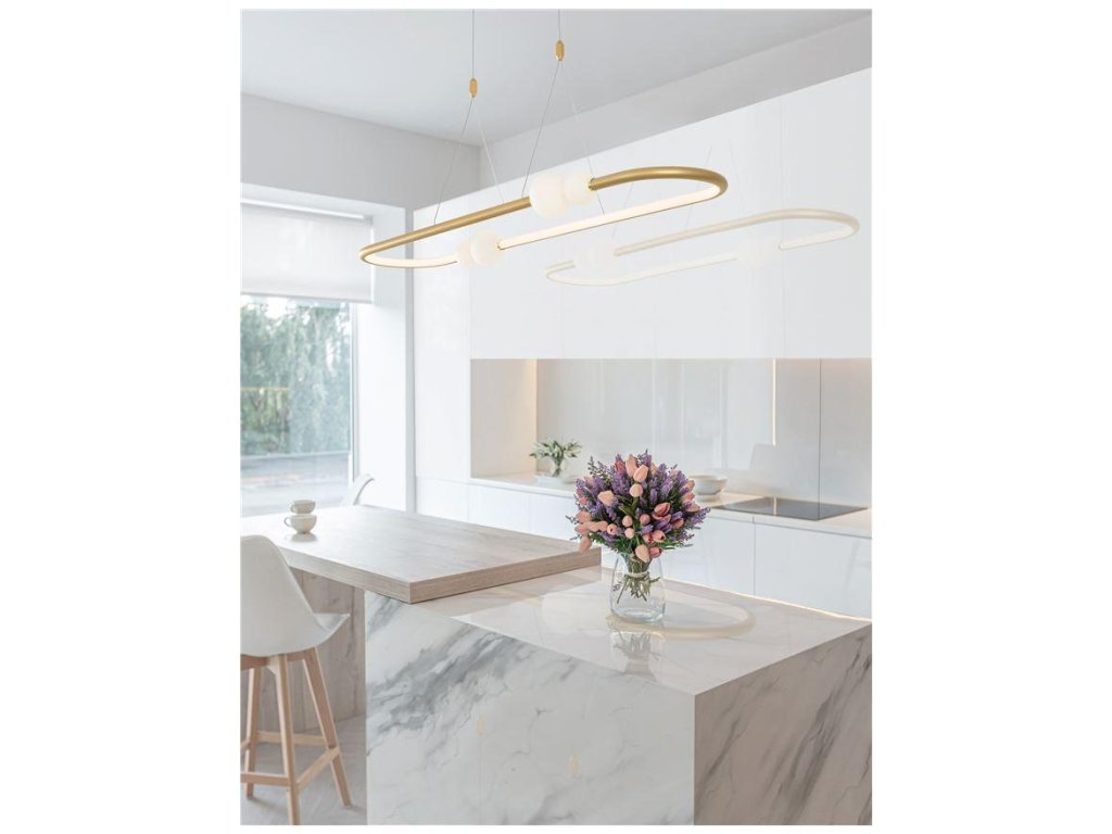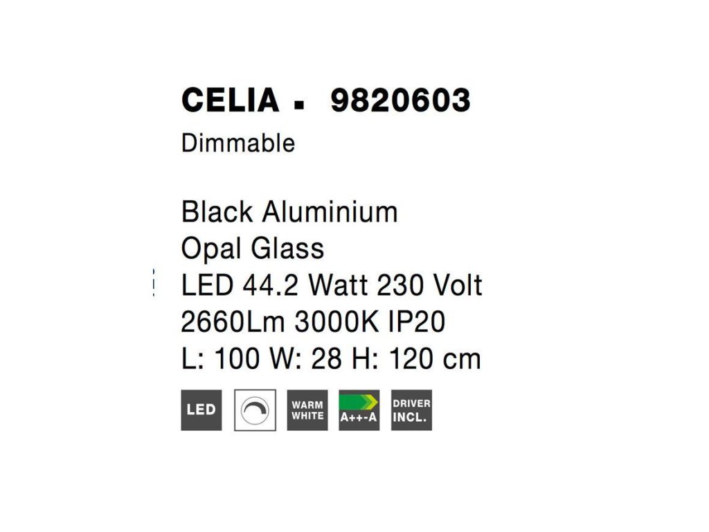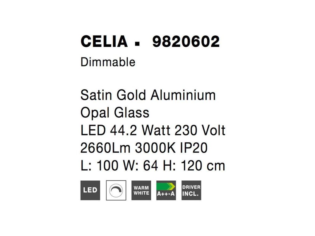 Závesné svietidlo CELIA 44,2W je k dispozícii v čiernej a zlatej farbe. Svietidlo je vyrobené z kovu skla. Rozmery svietidla sú 100x120 cm. Integrovaný LED zdroj vydáva teplé biele svetlo (3000K). Svietivosť zdroja je 2660 lúmenov a je stmievateľný systémom TRIAC a diaľkovým ovládačom, ktorý je súčasťou balenia. Svietidlo odporúčame nad jedálenský stôl alebo do obývačky.