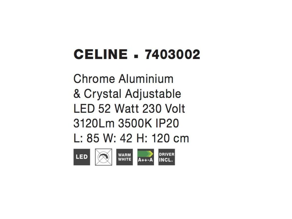Luxusné závesné svietidlo CELINE je k dispozícii v chrómovej farbe. Svietidlo je vyrobené z krištáľu a hliníka. Rozmery svietidla sú 85x42x120 cm. Integrovaný LED zdroj vydáva teplé biele svetlo (3500K). Svietivosť zdroja je 3120 lúmenov a je nestmievateľný. Svietidlo pre svoje luxusné prevedenie odporúčame nad jedálenský stôl alebo do obývačky.