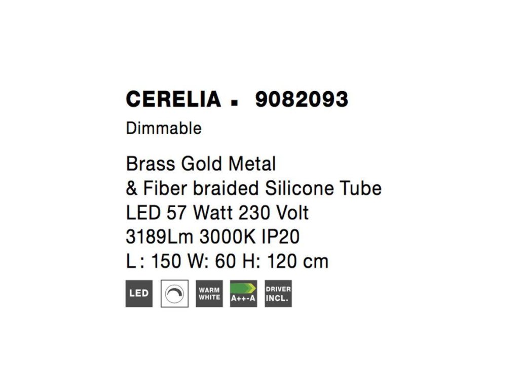 Závesné svietidlo CERELIA, 57W je k dispozícii v zlatej farbe. Svietidlo je vyrobené z kovu a silikónu. Rozmery svietidla sú 150x120 cm. Integrovaný LED zdroj vydáva teplé biele svetlo (3000K). Svietivosť zdroja je 3189 lúmenov a je stmievateľný systémom TRIAC. Svietidlo pre svoj jedinečný design odporúčame nad jedálenský stôl, do obývacej izby alebo spálne.