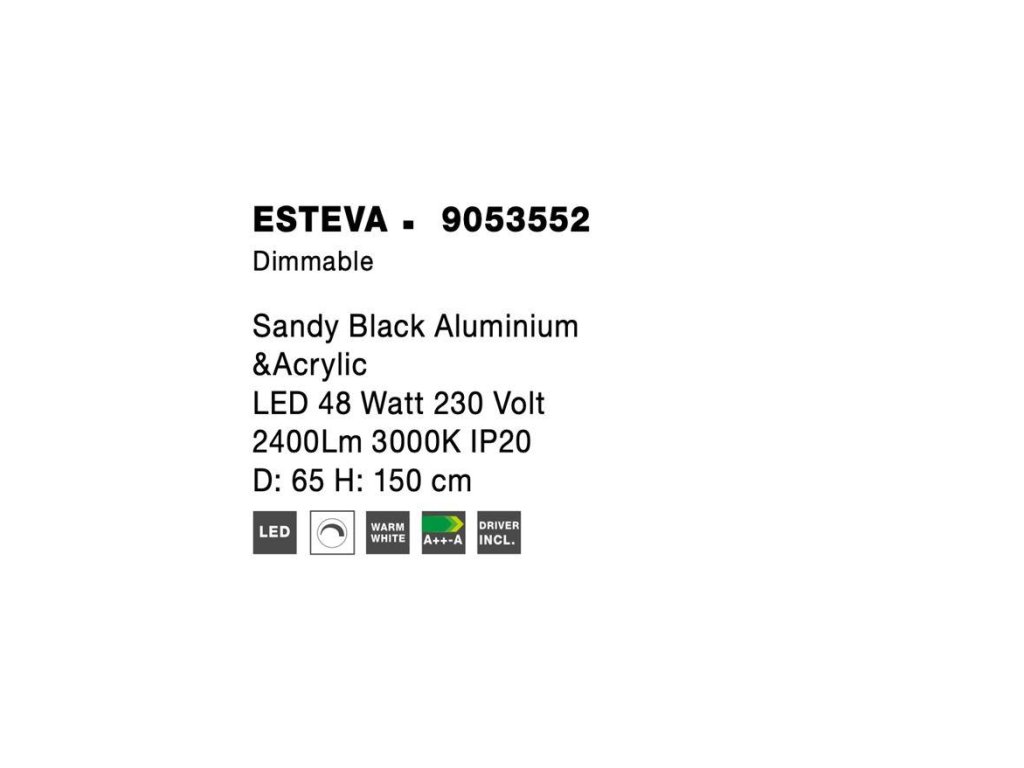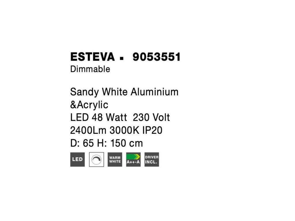 Závesné svietidlo ESTEVA, 48W je k dispozícii v bielej, čiernej a hnedej farbe. Svietidlo je vyrobené z hliníka a akrylu. Rozmery svietidla sú 65x150 cm. Integrovaný LED zdroj vydáva teplé biele svetlo (3000K). Svietivosť zdroja je 2400 lúmenov a je stmievateľný systémom TRIAC. Svietidlo odporúčame nad jedálenský stôl, do obývacej izby alebo spálne.