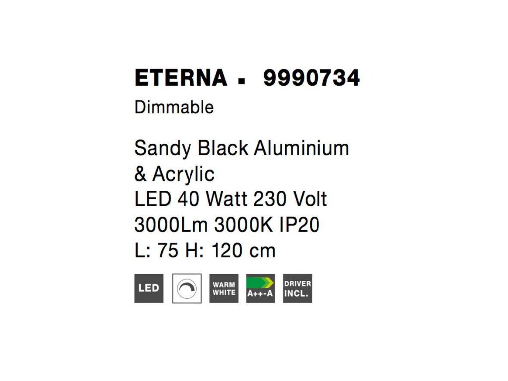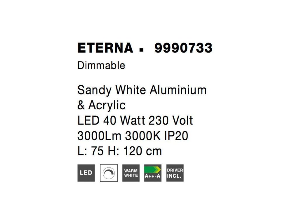 Závesné svietidlo ETERNA, 40W je k dispozícii v bielej a čiernej farbe. Svietidlo je vyrobené z hliníka a akrylu. Rozmery svietidla sú 75x120 cm. Integrovaný LED zdroj vydáva teplé biele svetlo (3000K). Svietivosť zdroja je 3000 lúmenov a je stmievateľný systémom TRIAC. Svietidlo odporúčame nad jedálenský stôl, do obývacej izby alebo spálne.