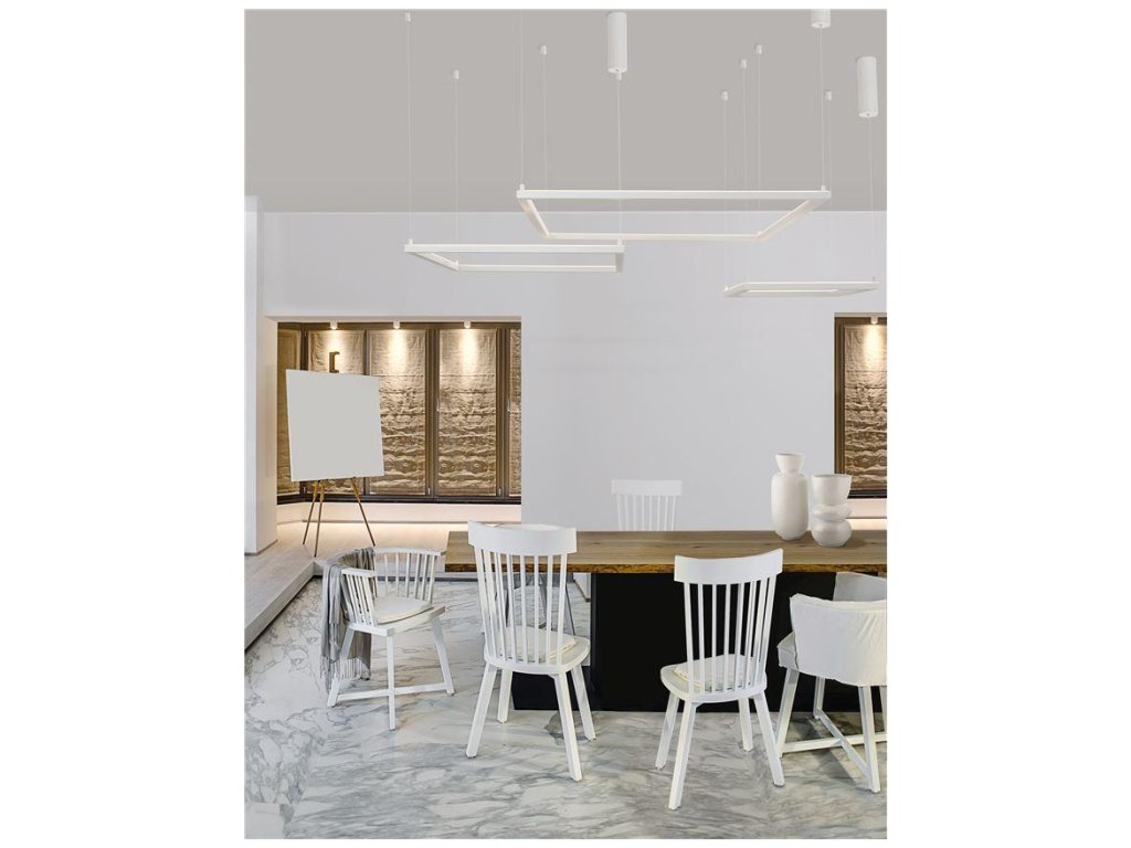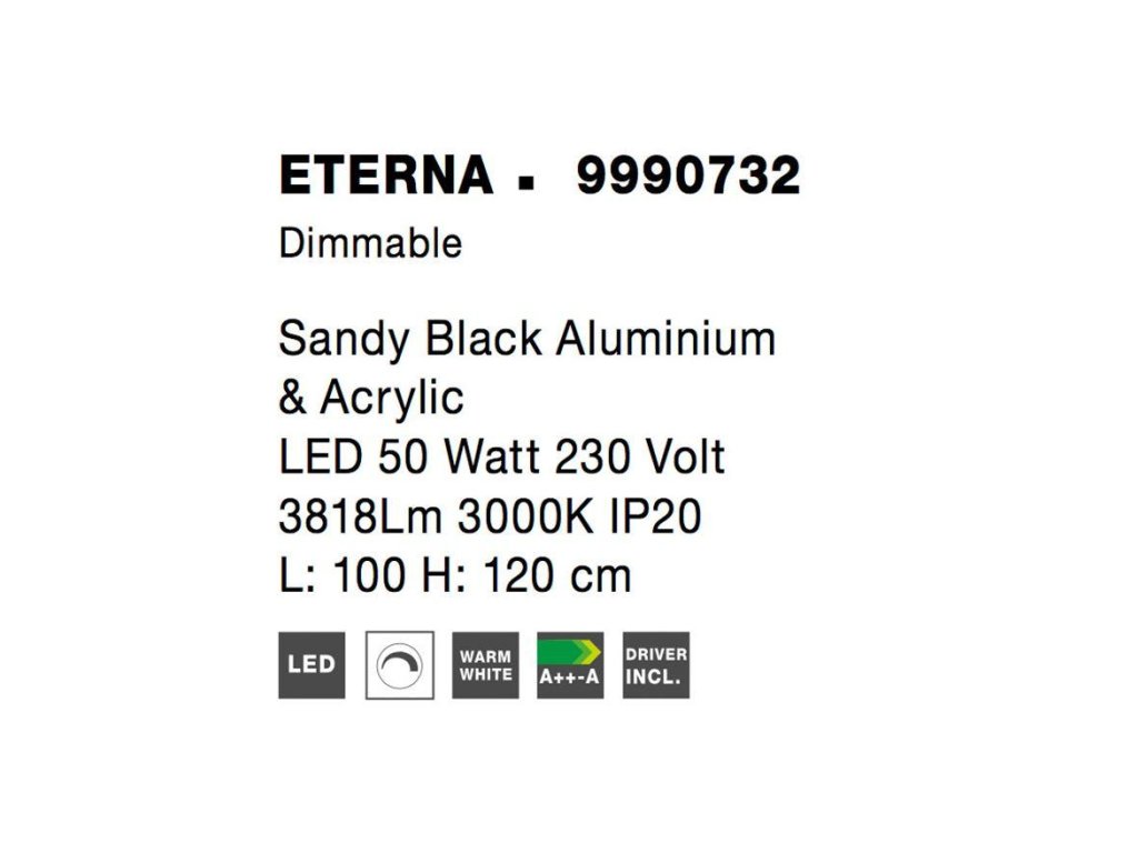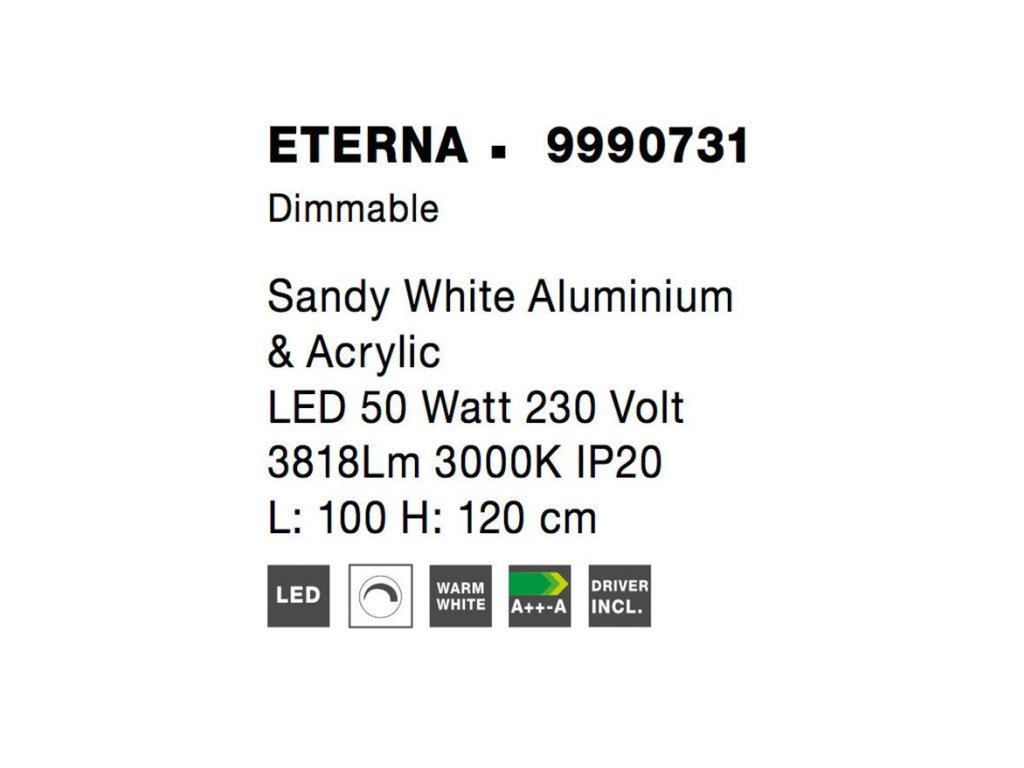 Závesné svietidlo ETERNA, 50W je k dispozícii v bielej a čiernej farbe. Svietidlo je vyrobené z hliníka a akrylu. Rozmery svietidla sú 100x120 cm. Integrovaný LED zdroj vydáva teplé biele svetlo (3000K). Svietivosť zdroja je 3818 lúmenov a je stmievateľný systémom TRIAC. Svietidlo odporúčame nad jedálenský stôl, do obývacej izby alebo spálne.