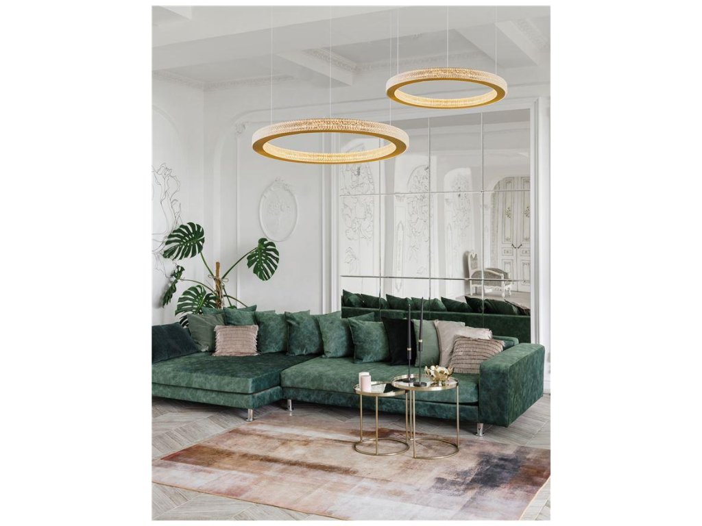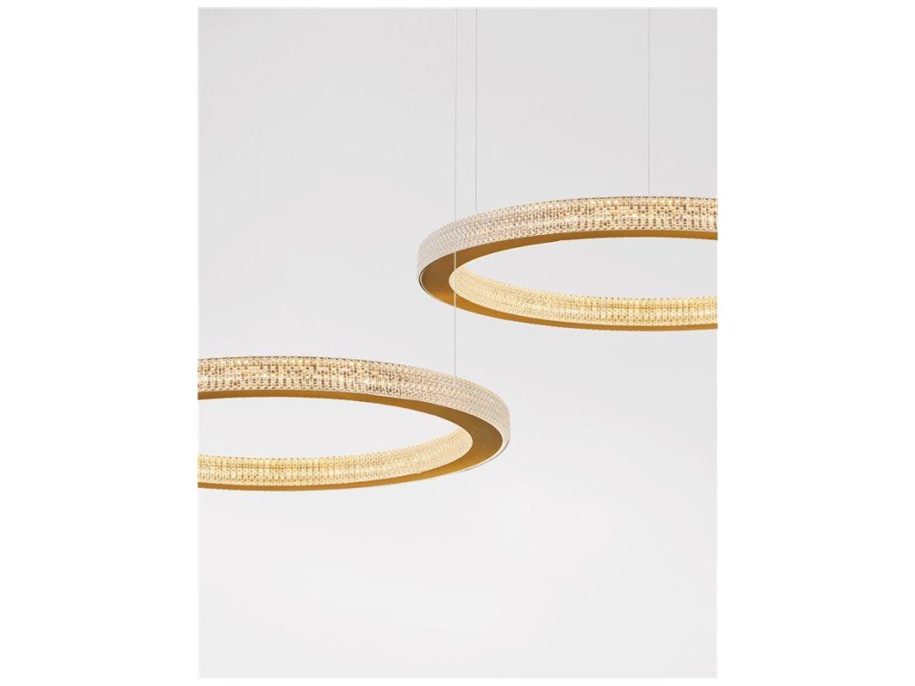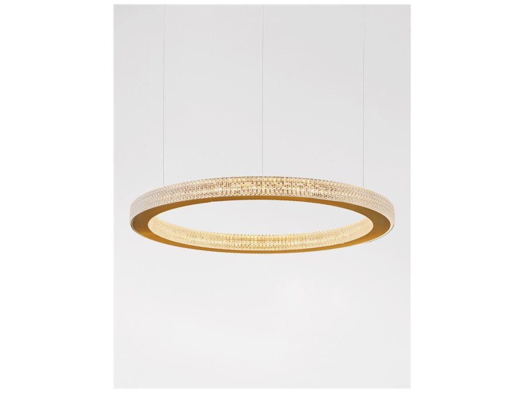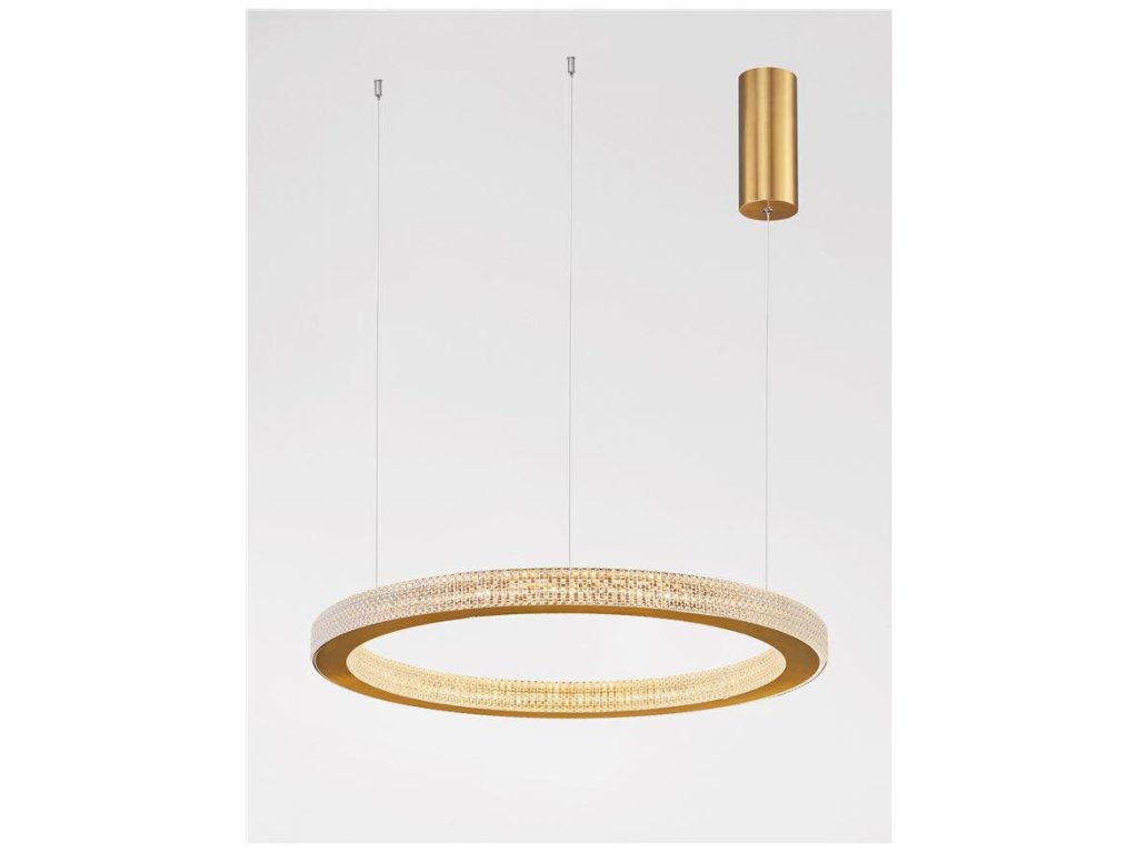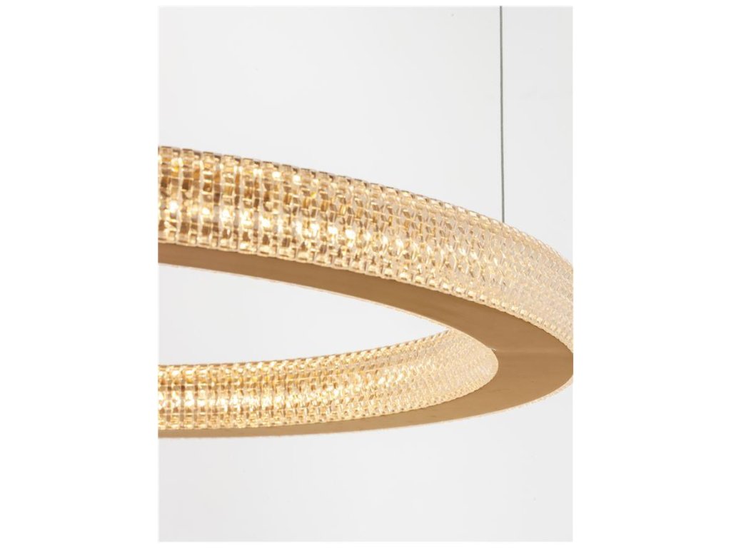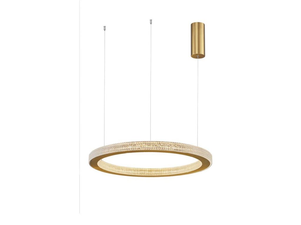 Závesné svietidlo FIORE, 60W je k dispozícii v zlatej farbe. Svietidlo je vyrobené z hliníka a akrylu. Rozmery svietidla sú 60x120 cm. Integrovaný LED zdroj vydáva teplé biele svetlo (3000K). Svietivosť zdroja je 3530 lúmenov a je stmievateľný systémom TRIAC. Svietidlo odporúčame nad jedálenský stôl, do obývacej izby alebo spálne.