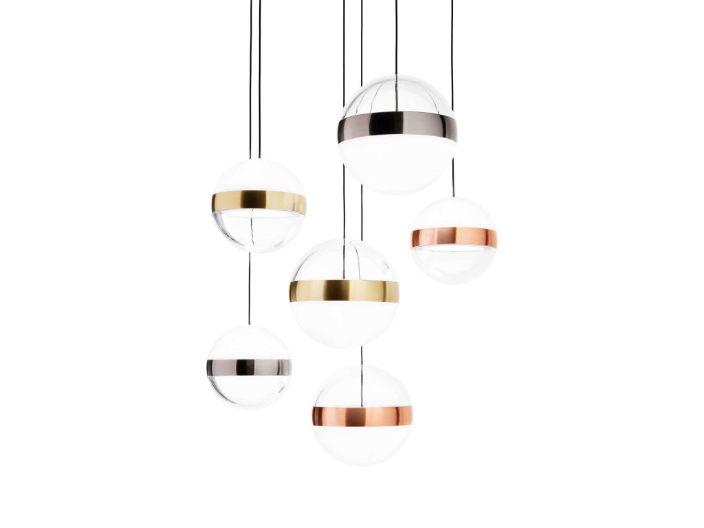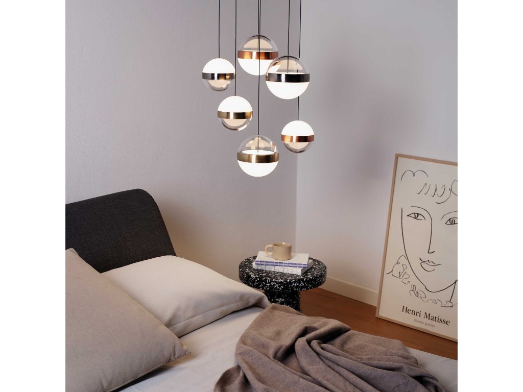 Závesné LED svietidlo GALAXY so šiestimi svetelnými zdrojmi. Svietidlo má difúzory z opálu a priehľadného akrylu s centrálnymi vložkami z kovu vo farbe brúseného niklu, mosadze a medi. Káble sú vyrobené z čierneho PVC a rozeta z kovu. Svietidlo sa skvele hodí do obývačky.