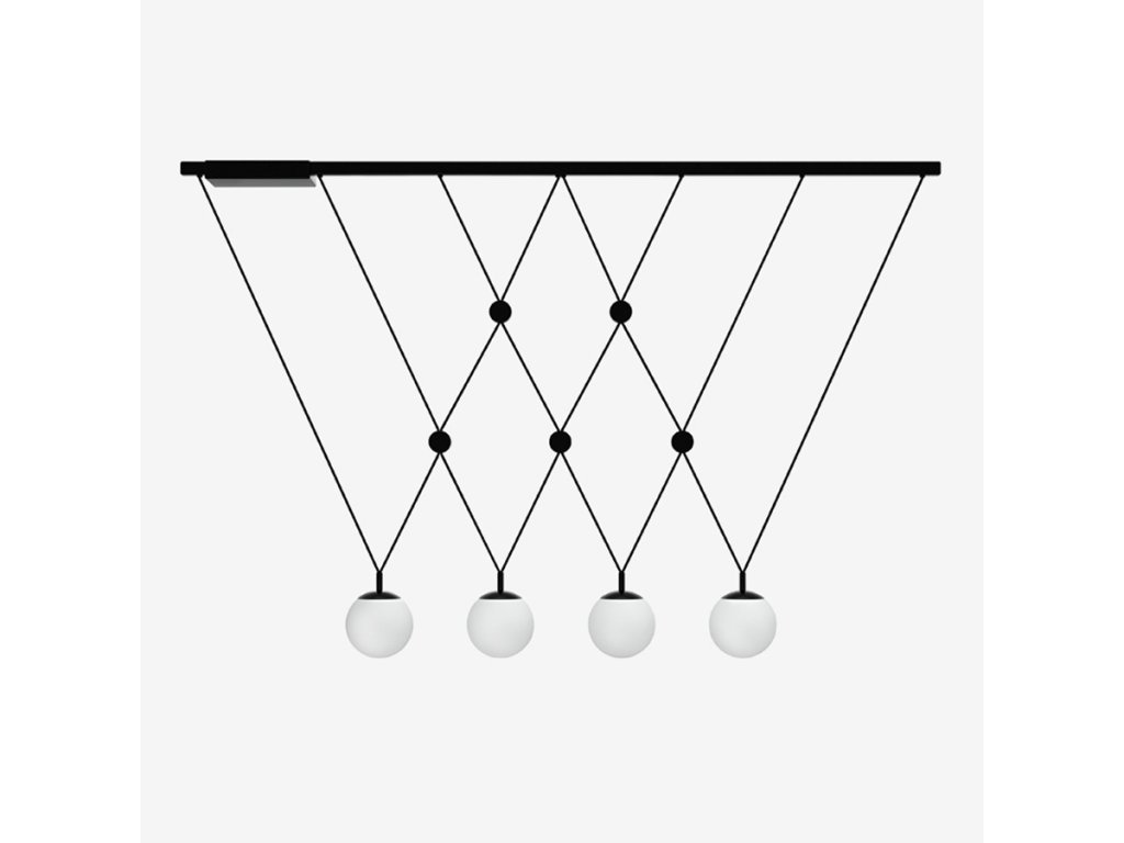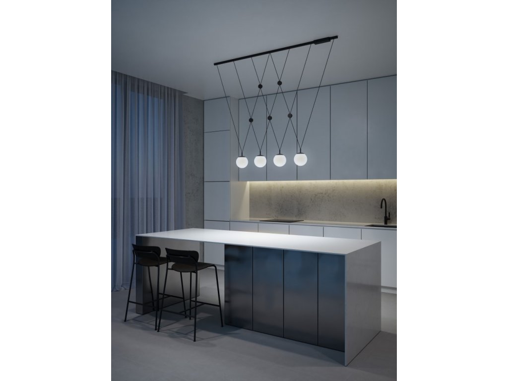 Dizajnové závesné LED svietidlo GEO vyrobené z ocele v čiernej farbe s matne opálovým ručne fúkaným difúzorom z trojvrstvového skla. Rozmery svietidla činia v95xš170 cm. Priemer tienidla je 15 cm. Na výber sú varianty s chromatickosťou 3000K a 4000K s možnosťou stmievania alebo bez. Toto výnimočné svietidlo sa skvele hodí do obývacej izby, kuchyne, nad jedálenský stôl alebo do spálne.