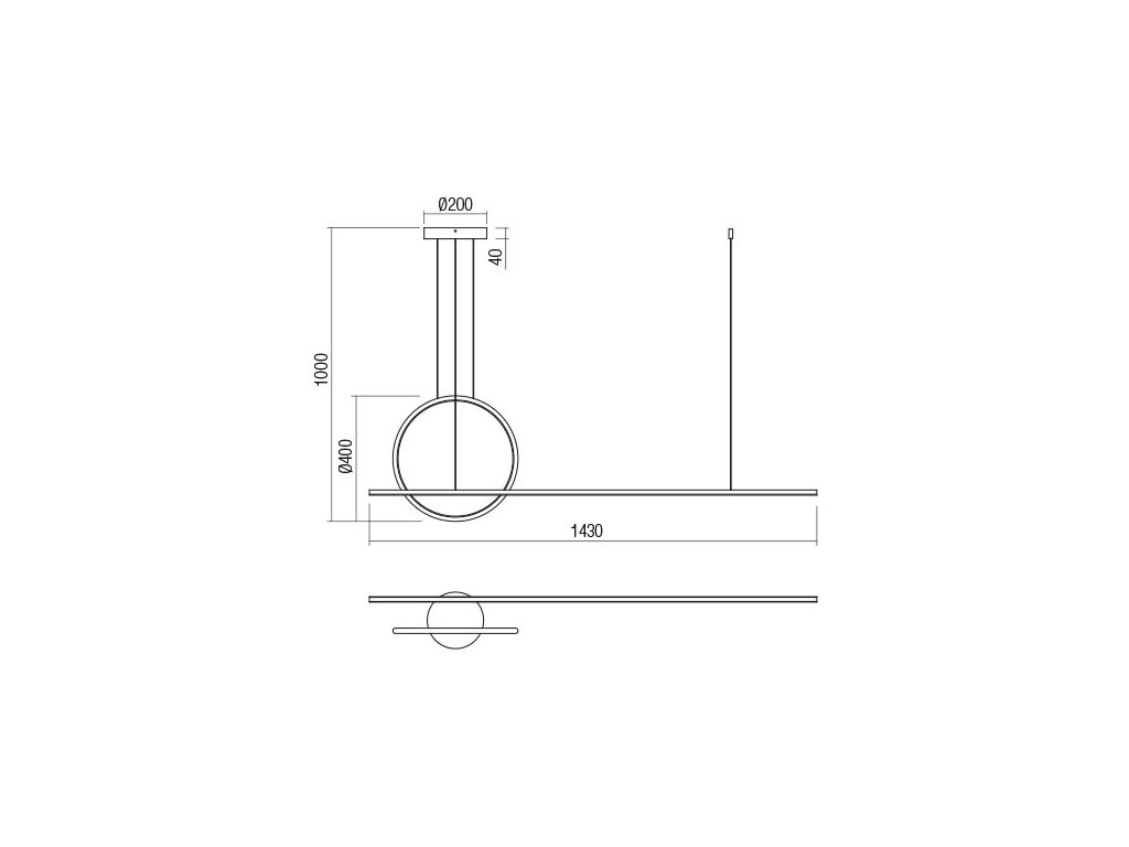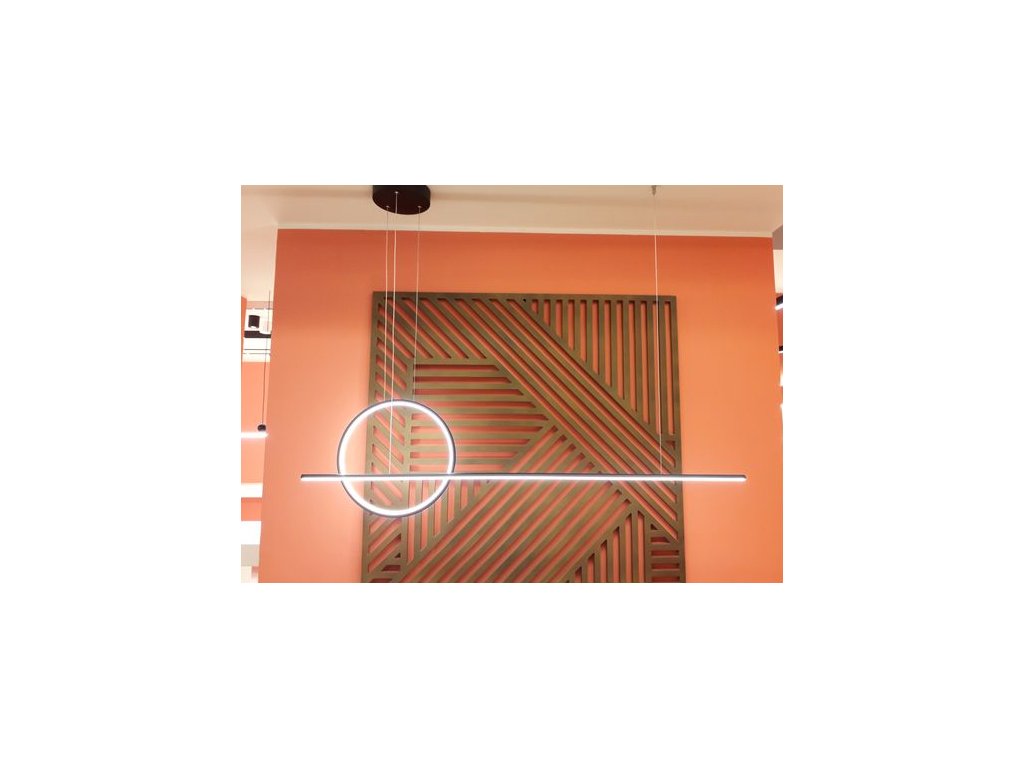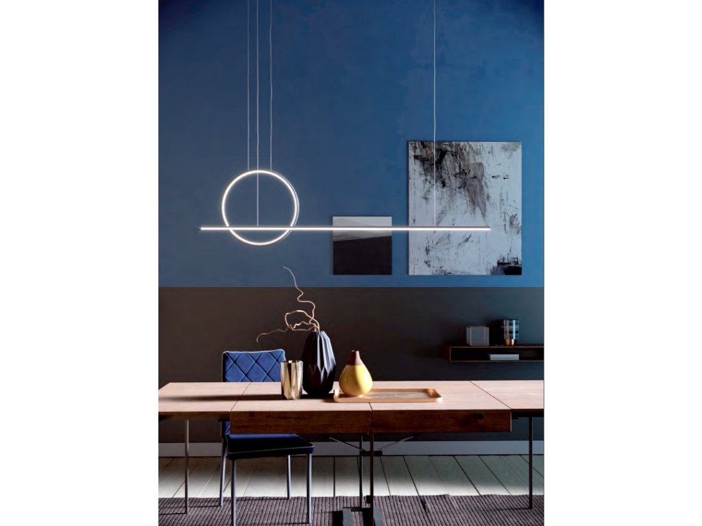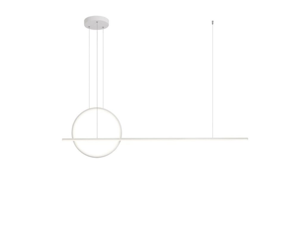 Moderné LED závesné osvetlenie z kolekcie Giotto v matnej bielej alebo čiernej farbe. Kruh aj lišta visí na samostatných lankových závesoch. SMD LED diódy 49W na spodnej strane líšt a vnútornej strane kruhu vydávajú teplé biele svetlo 3000K. Konštrukcia z hliníka a kovu elektrostaticky lakovaná v matnej bielej alebo čiernej, difúzor z opálovo bieleho silikónu. Dĺžka svietidla je 143cm, priemer kružnice je 40cm, dĺžka závesu 100cm s možnosťou skrátenia. Svietidlo je vhodné nad jedálenský stôl alebo ako osvetlenie jedálne či kuchyne.