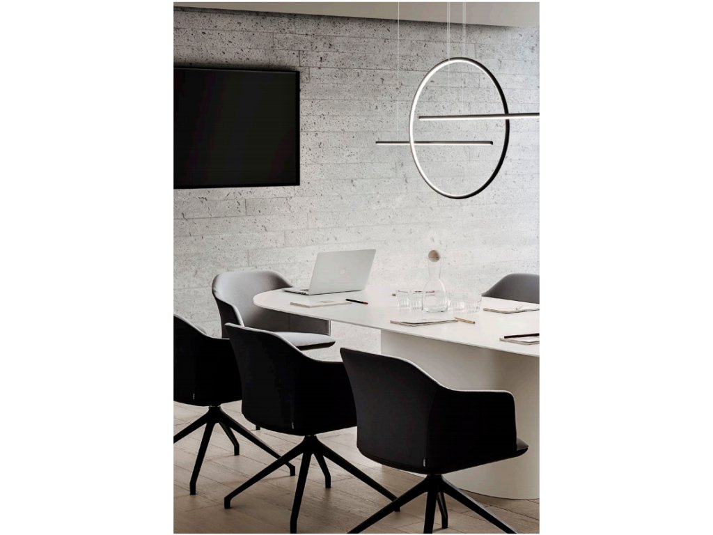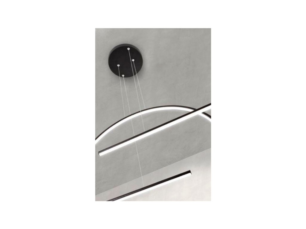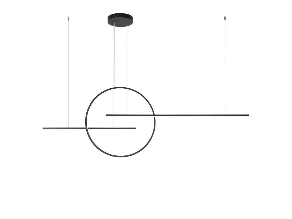 Moderné LED závesné osvetlenie z kolekcie Giotto v matnej bielej alebo čiernej farbe. Kruh aj lišta visí na samostatných lankových závesoch. SMD LED diódy 56W na spodnej strane líšt a vnútornej strane kruhu vydávajú teplé biele svetlo 3000K. Konštrukcia z hliníka a kovu elektrostaticky lakovaná v matnej bielej alebo čiernej, difúzor z opálovo bieleho silikónu. Dĺžka svietidla je 143cm, priemer kružnice je 40cm, dĺžka závesu 100cm s možnosťou skrátenia. Svietidlo je vhodné nad jedálenský stôl alebo ako osvetlenie jedálne či kuchyne.