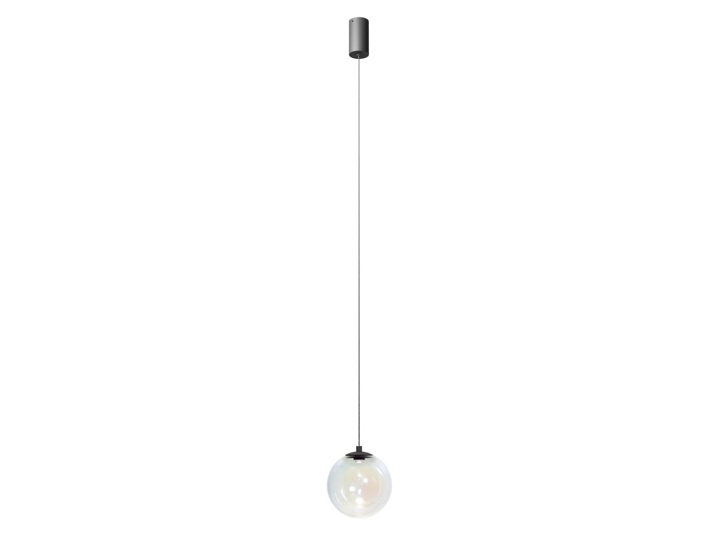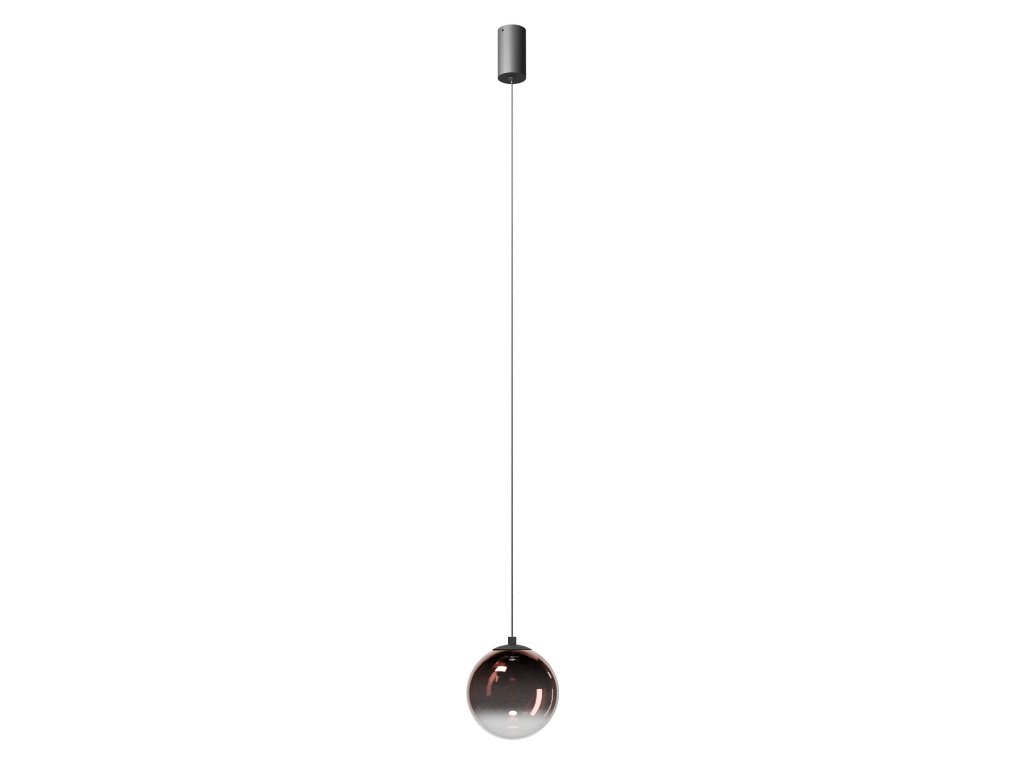 Závesné svietidlo do interiéru s jednou COB LED, s kovovou a hliníkovou konštrukciou lakovanou matnou čiernou farbou, a difúzorom z lesklého transparentného, kávového, dymového alebo dichroického fúkaného skla.