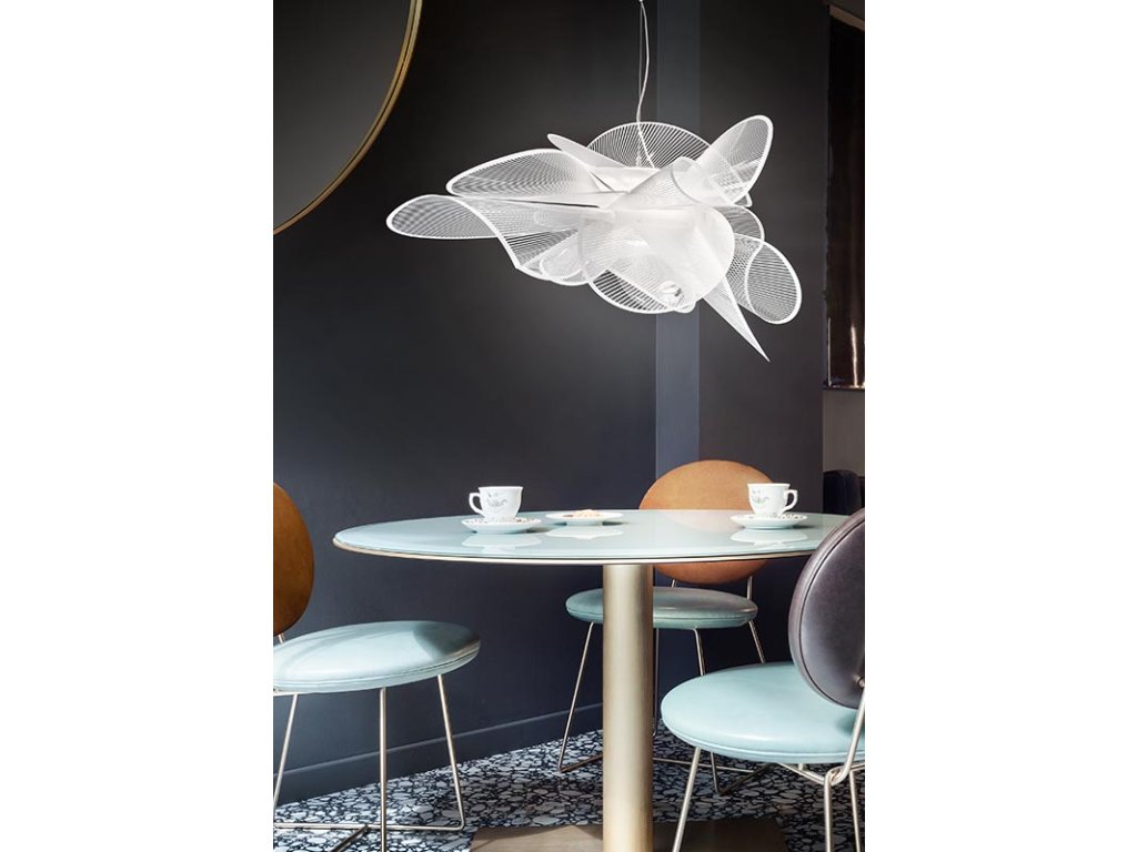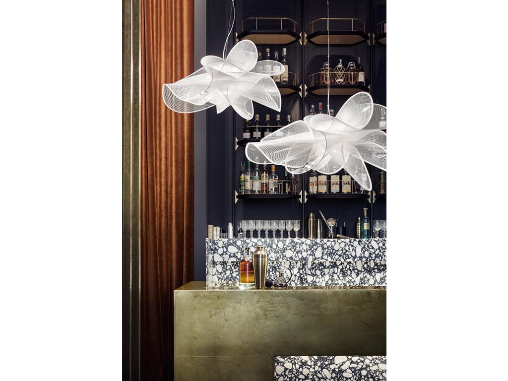 Elegantný a zmyselný pohyb je súčasťou vizuálnej gramatiky La Belle Étoile; zavesenie je inšpirované ladným krúžením baletky. Ľahká, ale nerozbitná lampa je kompletne ručne vyrobená v ateliéri Slamp. Dialóg medzi technologickou inováciou a štylistickou originalitou hovorí jasnou rečou; LED zdroj je možné ľahko a rýchlo vymeniť vďaka exkluzívnemu magnetickému závesnému systému a biela textúra natlačená na priehľadných polyméroch sú prvky, ktoré dohromady vytvárajú rafinovaný, moderný dizajn. Toto moderné svietidlo sa dodáva v dvoch veľkostiach na zavesenie a vo verzii pre strop/aptik, v závislosti od typu priestoru v čiernej alebo bielej farbe. Obe verzie predstavujú univerzálne avantgardné riešenie osvetlenia ponúkajúce minimalistickú, očarujúcu estetiku. La Belle Étoile prináša do radu interiérov skulpturálne osvetlenie s intenzitou osvetlenia od 0 do 100 podľa vkusu tých, ktorí si ju vybrali.