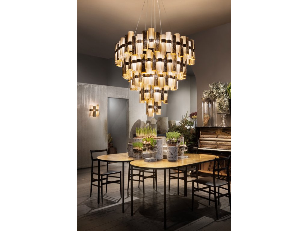 - závesné svietidlo La Lonna, ktoré sa vyznačuje sofistikovanými chromatickými odtieňmi, metalickými povrchovými úpravami a efektmi inšpirovanými textilom, vám umožňuje osvetliť a ozdobiť interiéry s všestrannosťou a eleganciou.