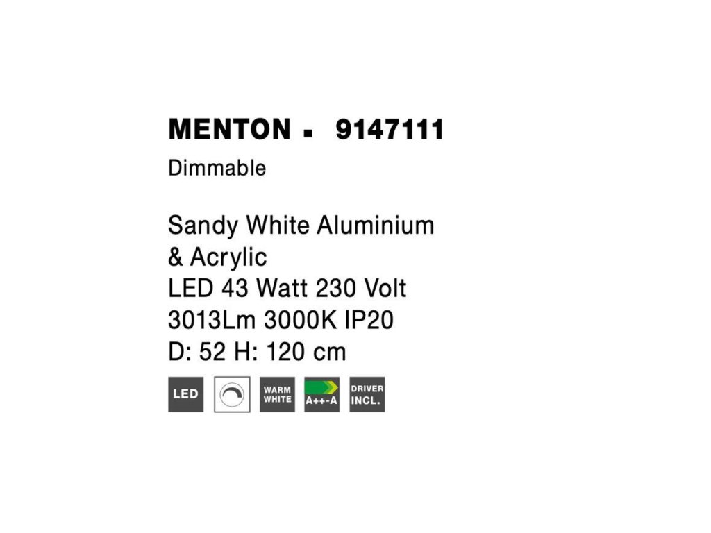 Závesné svietidlo MENTON, 43W je k dispozícii v bielej, čiernej a hnedej farbe. Svietidlo je vyrobené z hliníka a akrylu. Rozmery svietidla sú 52x120 cm. Integrovaný LED zdroj vydáva teplé biele svetlo (3000K). Svietivosť zdroja je 3013 lúmenov a je stmievateľný systémom TRIAC. Svietidlo odporúčame nad jedálenský stôl, do obývacej izby alebo spálne.