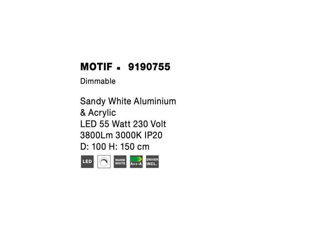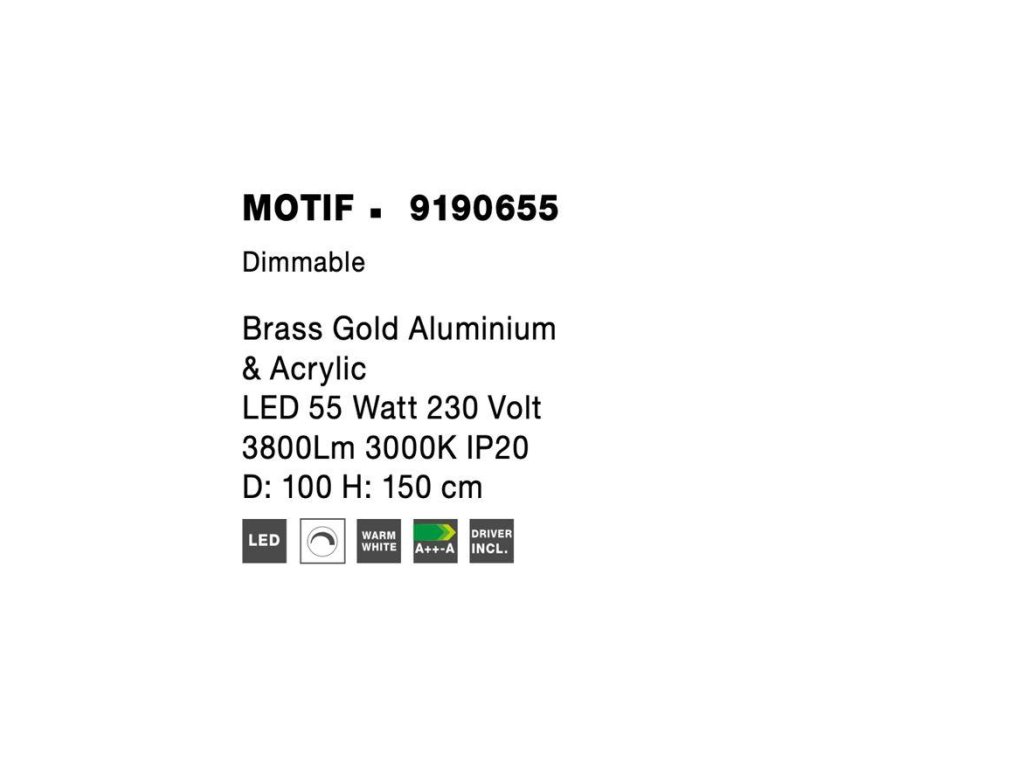 Závesné svietidlo MOTIF, 55W je k dispozícii v bielej, čiernej a mosadznej farbe. Svietidlo je vyrobené z hliníka a akrylu. Rozmery svietidla sú 100x150 cm. Integrovaný LED zdroj vydáva teplé biele svetlo (3000K). Svietivosť zdroja je 3800 lúmenov a je stmievateľný systémom TRIAC. Svietidlo odporúčame nad jedálenský stôl, do obývacej izby alebo spálne.