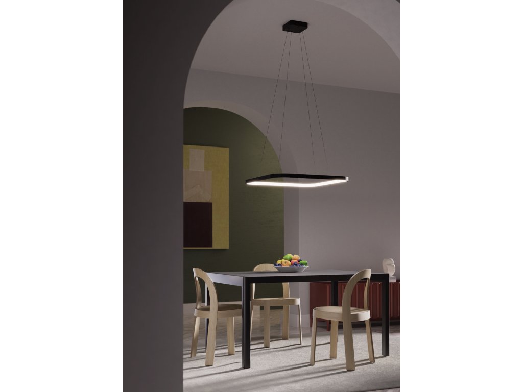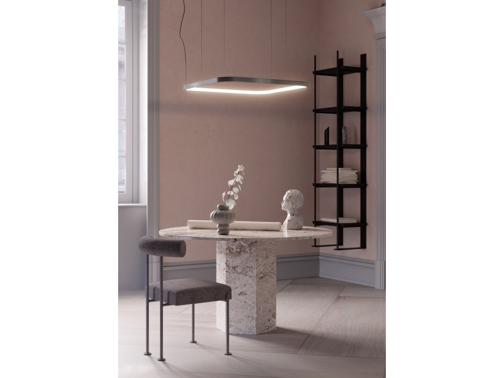 Závesné interiérové svietidlo vybavené SMD LED diódami s možnosťou stmievania DALI stmievačom a ovládanie teploty farieb od teplej bielej po neutrálnu bielu. Konštrukcia hliníka a kovu lakovaná pieskovou čiernou, bielou, niklovou alebo hnedou farbou, difúzor v bielom opálovom silikóne.