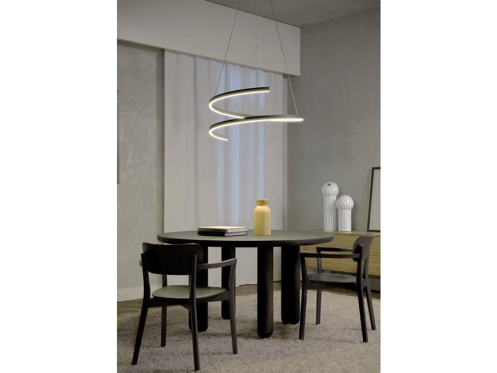Závesné interiérové svietidlo vybavené SMD LED, stmievateľné a s možnosťou regulácie teploty farieb od teplej bielej po neutrálnu bielu. Hliníková a kovová konštrukcia lakovaná pieskovo čiernou, bielou alebo bronzovou farbou, opálovo biely silikónový difúzor.