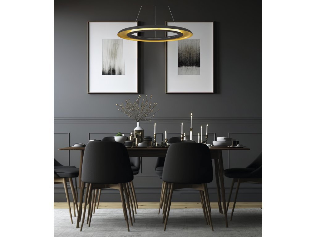 Moderné veľmi elegantný závesné LED svietidlo v tvare prstenca plní nielen funkciu osvetlenia priestoru, ale predovšetkým, pre svoju kombináciu čiernej a zlatej farby, skvele funguje aj ako dekoratívny prvok danej miestnosti.