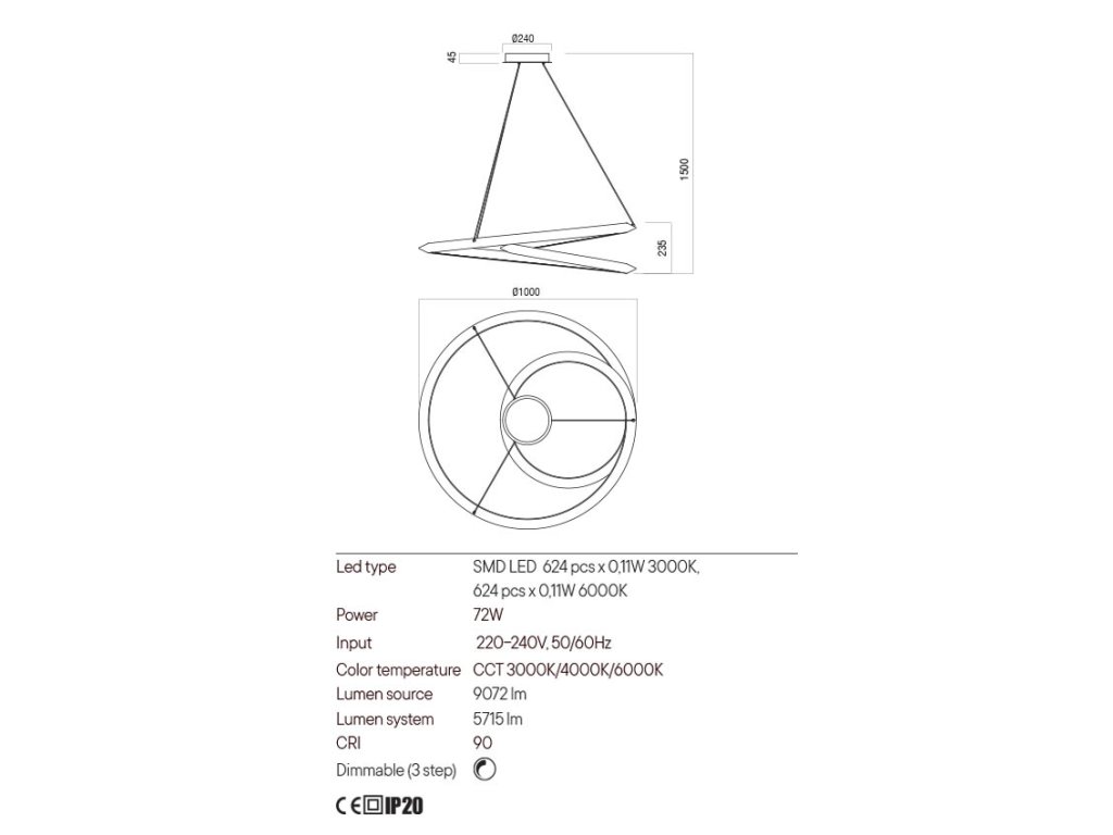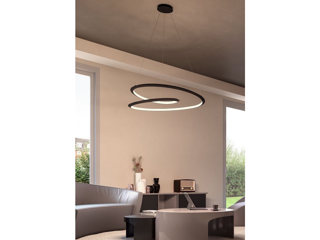 Závesné svietidlo do interiéru, osadené SMD LED diódami, s možnosťou voľby teploty farby svetla. Elektorstaticky lakovaná kovová a hliníková konštrukcia k dispozícii v troch farebných variantoch s bielym PVC difúzorom.