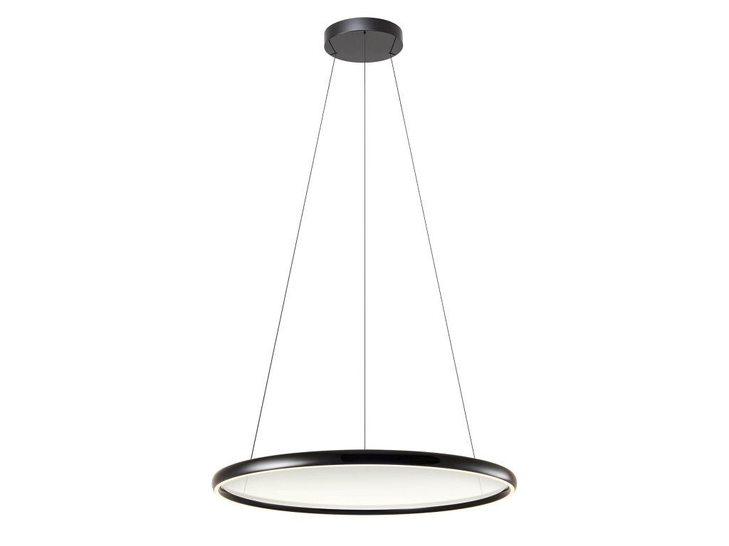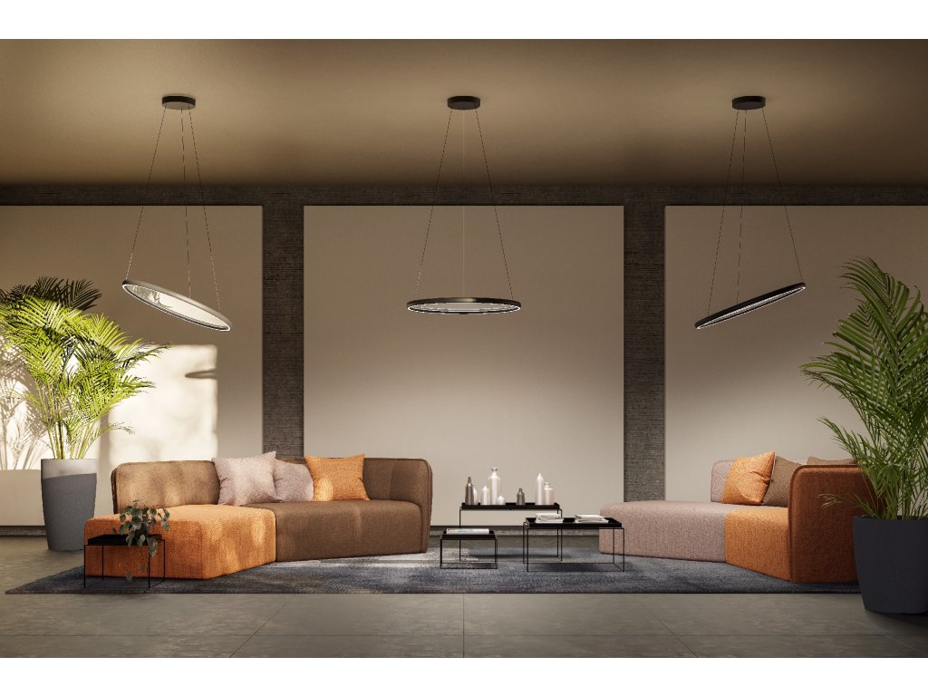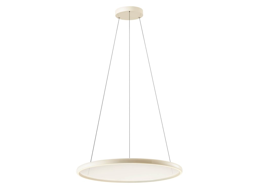 LED interiérové závesné svietidlo so stmievaním a reguláciou teploty farieb, s konštrukciou z kovu a tlakovo liateho hliníka lakovanou lesklo bielou, čiernou alebo béžovou farbou, bielym silikónovým difúzorom pre priame svetlo a centrálnym difúzorom z priehľadného PMMA.