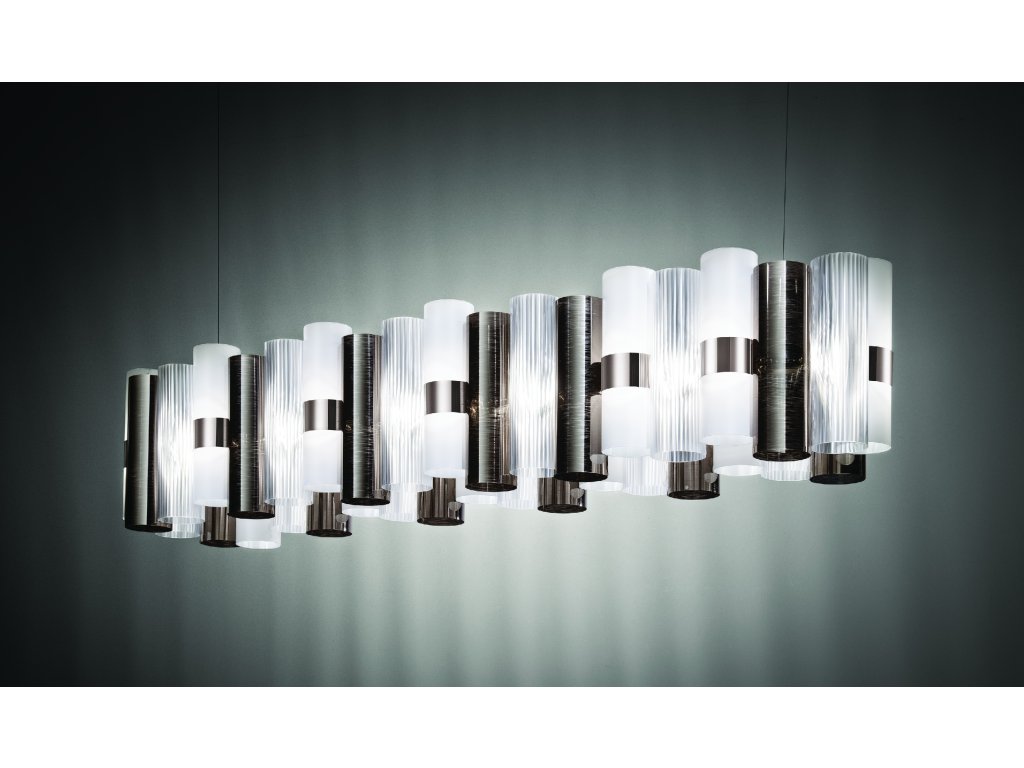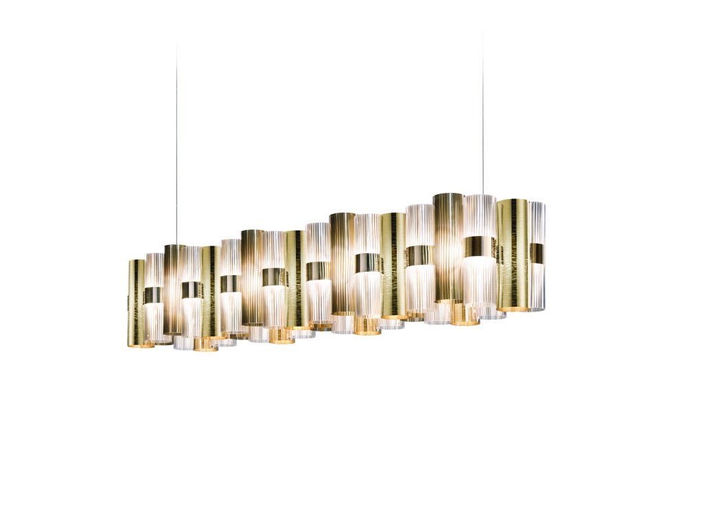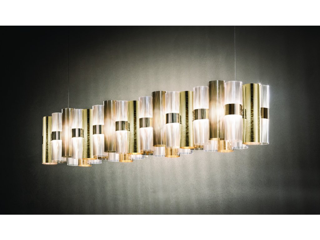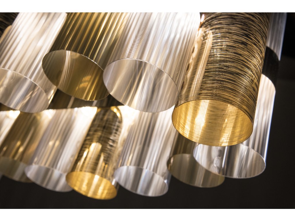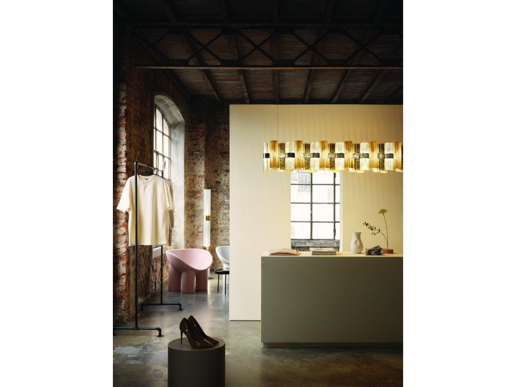 - závesné svietidlo La Lollo, ktoré sa vyznačuje sofistikovanými chromatickými odtieňmi, metalickými povrchovými úpravami a efektmi inšpirovanými textilom, vám umožňuje osvetliť a ozdobiť interiéry s všestrannosťou a eleganciou.