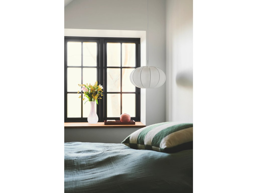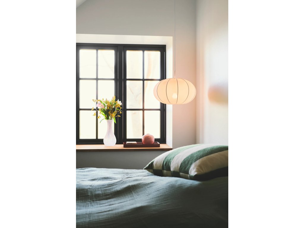Aeron má vzdušný dizajn a svetlý odtieň látky, ktorý poskytuje rovnomerné a príjemné svetlo - ideálne na vytvorenie útulnej atmosféry v spálni. Lampu je možné ľahko zostaviť pomocou drôtov a vstavaného povrázku.