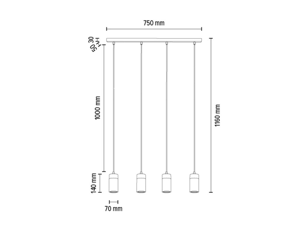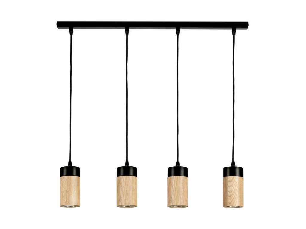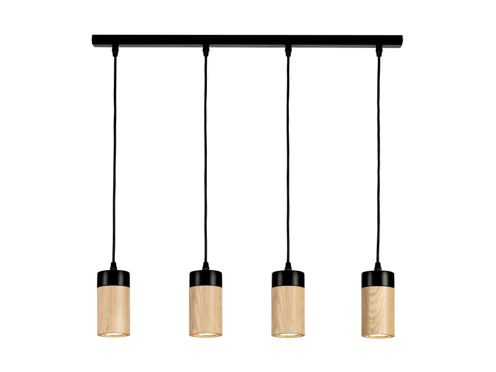 Kombinácia čierneho kovu a dubového dreva v olejovanom prevedení, so štyrmi svetelnými bodmi v jednej línii, dodáva tomuto svietidlu luxusný a nadčasový vzhľad.