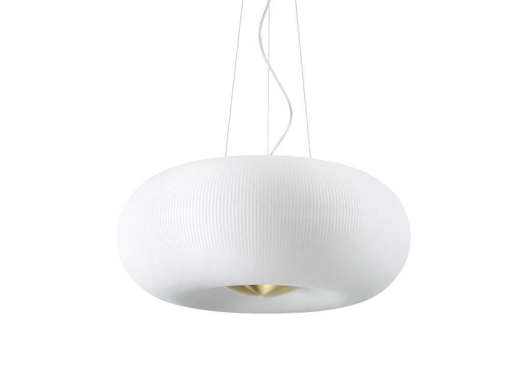 Štýlový závesný luster ARIZONA SP5 z kolekcie interiérového osvetlenia Ideal Lux vo väčšom prevedení s priemerom 52 cm účelne nasvietia obývacie priestory, spálne a jedálne v modernom alebo klasickom interiéri. Kovový rám svietidla a dekoratívne doplnky majú mosadznú povrchovú úpravu. Príjemný rozptyl svetla poskytuje difúzor z brúseného mliečneho skla, na ktorom sú vyrazené ozdobné prúžky. Luster je osadený päticami GX53 s maximálnym príkonom 5 x 15 W. Súčasťou balenia je LED žiarovka s príkonom 5 x 9,5 W a teplotou chromatickosti 3000K (teplé biele svetlo). Dĺžku zavesenia oceľových laniek je možné ľubovoľne nastaviť pri inštalácii podľa potreby od 37,5 do 116,5 cm. Krytie IP20 je vhodné na použitie do interiéru.Dodatočné parametre