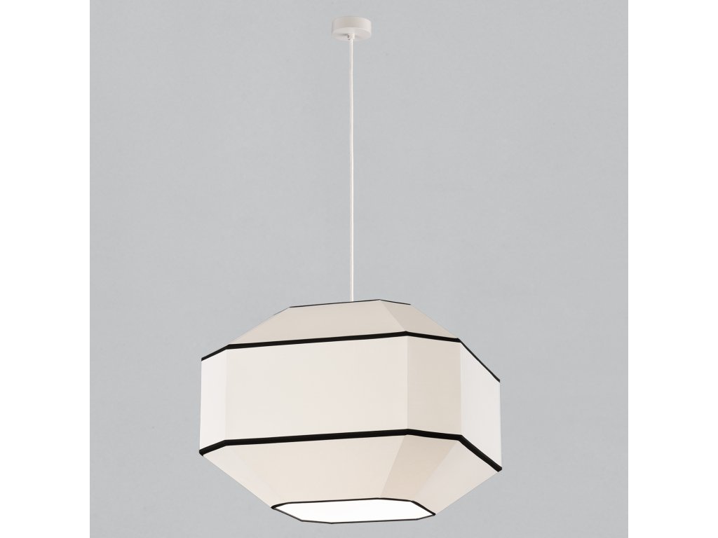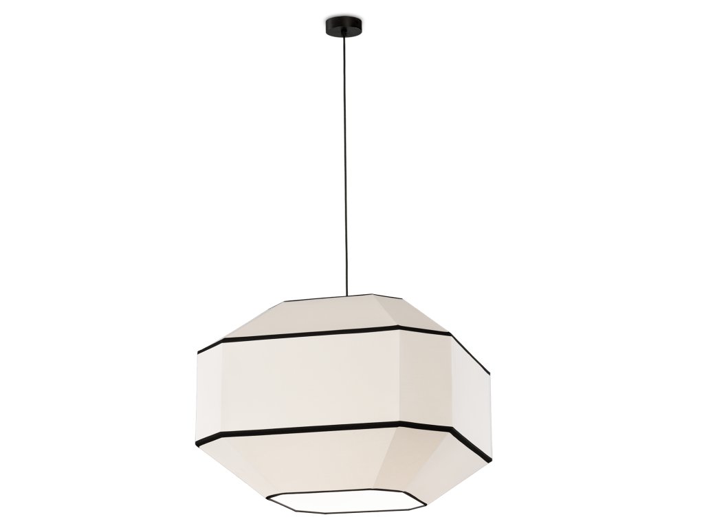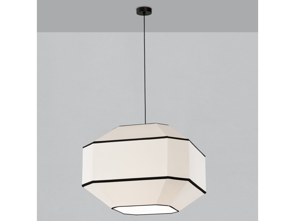 Atraktívne závesné LED svietidlo BAUHAUSmoderného dizajnu pozostáva z polygonálneho bavlneného tienidla a kovového závesu.