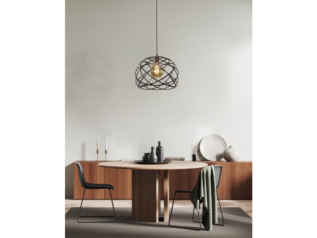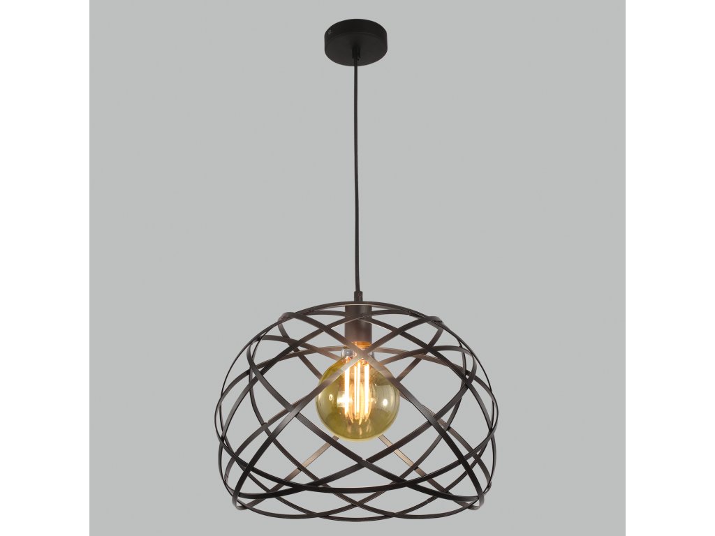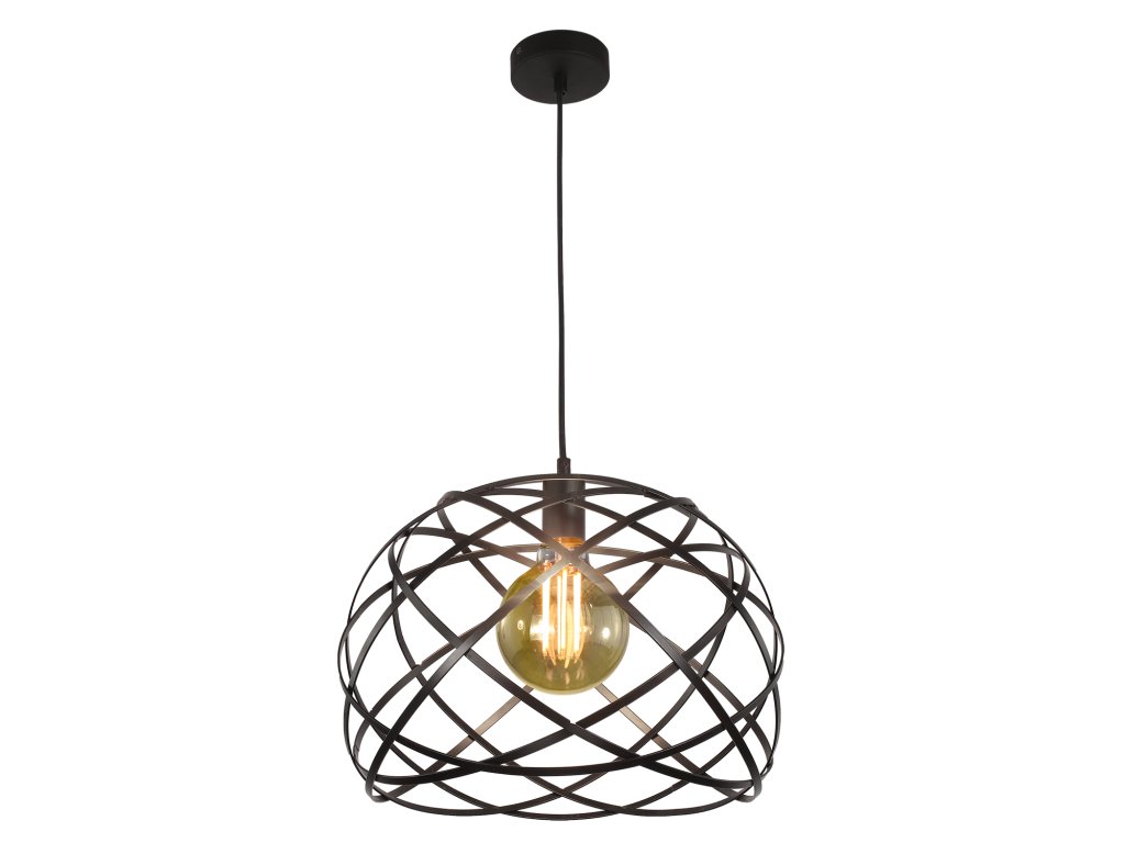 Originálne závesné LED svietidlo BELLONA v industriálnom štýle s tienidlom v tvare pologule, ktorá je tvorená z prepletených čiernych kovových pásikov s viditeľnou žiarovkou uprostred.