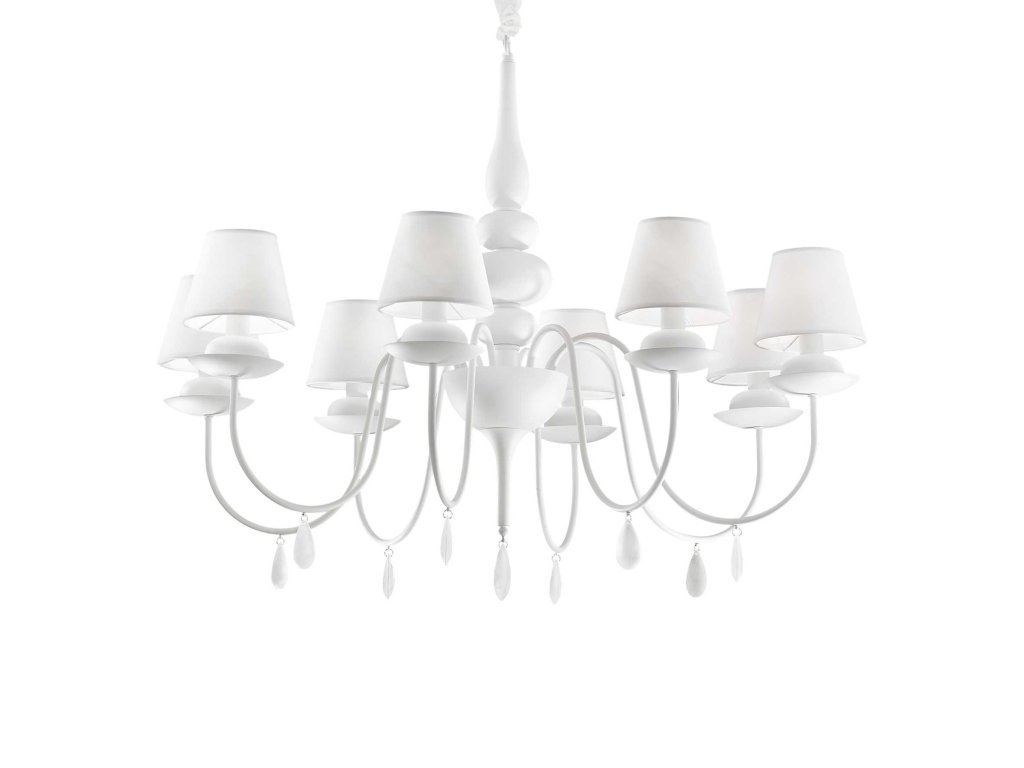 Klasický osemramenný luster BLANCHE SP8 v bielom prevedení v zámockom štýle s textilnými tienidlami. Určené na použitie so šiestimi žiarovkami E14 max 8x40W. Balenie bez žiaroviek.Dodatočné parametre