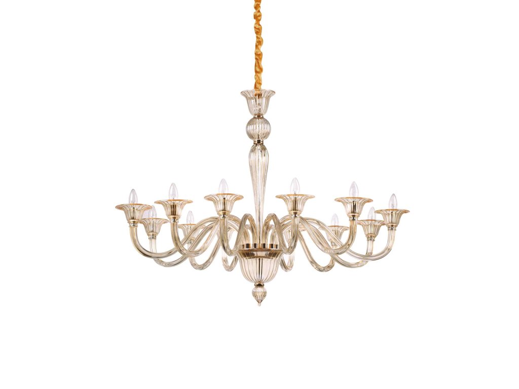 Jemný závesný luster BRIGITTA SP12 z kolekcie dizajnového osvetlenia Ideal Lux vo väčšom prevedení s priemerom 120 cm v oranžovej ambra farbe sa stane dominantou akéhokoľvek interiéru v klasickom aj modernom štýle. Jeho design vynikne predovšetkým v miestnostiach s vysokým stropom. Kovové telo dopĺňa ručne fúkané sklo s oranžovým nádychom. Závesná reťaz je potiahnutá hnedým zamatom a dĺžku jej zavesenia je možné ľubovoľne nastaviť pri inštalácii podľa potreby od 99,5 do 184 cm. Každé z dvanástich ramien je osadené päticou E14 s maximálnym príkonom 12 x 40 W. Žiarovky nie sú súčasťou balenia, pre úsporu elektrickej energie odporúčame zvoliť LED svetelné zdroje v tvare sviečky. Krytie IP20 je vhodné na použitie do interiéru.Dodatočné parametre