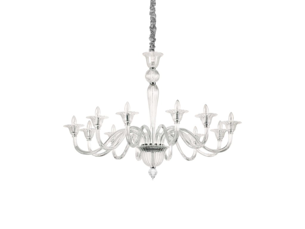 Jemný závesný luster BRIGITTA SP12 z kolekcie dizajnového osvetlenia Ideal Lux vo väčšom transparentnom prevedení s priemerom 120 cm sa stane dominantou akéhokoľvek interiéru v klasickom aj modernom štýle. Jeho design vynikne predovšetkým v miestnostiach s vysokým stropom. Kovové telo dopĺňa ručne číre fúkané sklo. Závesná reťaz je potiahnutá šedým zamatom a dĺžku jej zavesenia je možné ľubovoľne nastaviť pri inštalácii podľa potreby od 99,5 do 184 cm. Každé z dvanástich ramien je osadené päticou E14 s maximálnym príkonom 12 x 40 W. Žiarovky nie sú súčasťou balenia, pre úsporu elektrickej energie odporúčame zvoliť LED svetelné zdroje v tvare sviečky. Krytie IP20 je vhodné na použitie do interiéru.Dodatočné parametre