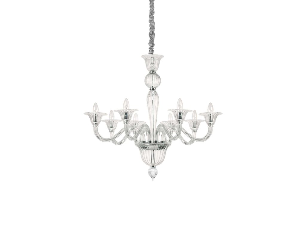 Jemný závesný luster BRIGITTA SP8 z kolekcie dizajnového osvetlenia Ideal Lux v menšom transparentnom prevedení s priemerom 89 cm sa stane dominantou akéhokoľvek interiéru v klasickom aj modernom štýle. Jeho design vynikne predovšetkým v miestnostiach s vysokým stropom. Kovové telo dopĺňa číre ručne fúkané sklo. Závesná reťaz je potiahnutá šedým zamatom a dĺžku jej zavesenia je možné ľubovoľne nastaviť pri inštalácii podľa potreby od 90 do 184 cm. Každé z ôsmich ramien je osadené päticou E14 s maximálnym príkonom 8 x 40 W. Žiarovky nie sú súčasťou balenia, pre úsporu elektrickej energie odporúčame zvoliť LED svetelné zdroje v tvare sviečky. Krytie IP20 je vhodné na použitie do interiéru.Dodatočné parametre