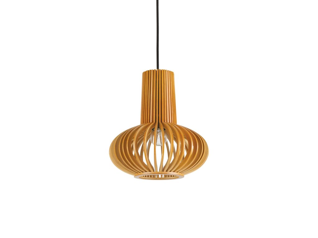 Závesný luster Citrus-2 s jedinečným retro rebrovaným tienidlom s priemerom 26 cm vyrobeným z prírodného dreva, cez ktorý prechádza svetlo a vytvára tak jedinečné svetelné efekty na stenách a strope. Vnútri je osadené päticou E27 pre žiarovku s maximálnym príkonom 1 x 60 W, ktorá nie je súčasťou balenia. Pre úsporu el. energie odporúčame použitie úspornej LED žiarovky. Stropná krytka s priemerom 12 cm je tiež vyrobená z prírodného dreva. Čierny textilný napájací kábel je možné ľubovoľne nastaviť pri inštalácii v dĺžke od 40 cm do 134 cm.Dodatočné parametre