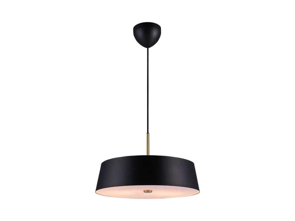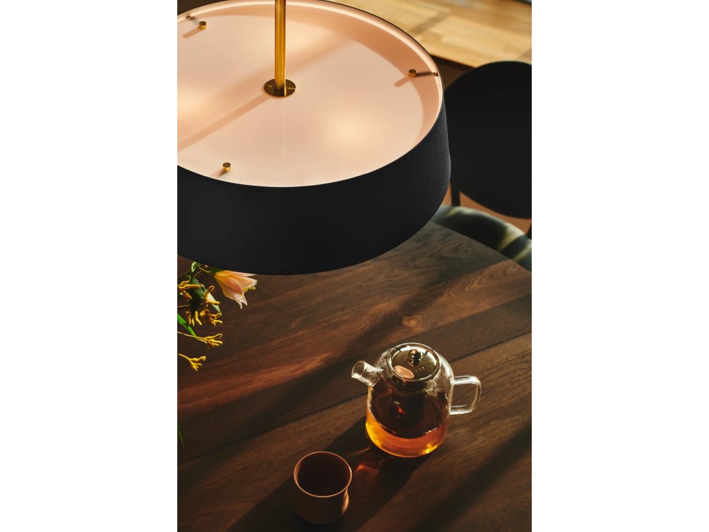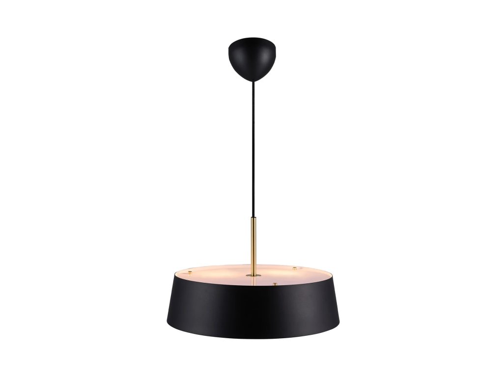 Masívne čierne kovové tienidlo doplnené ľahkým mosadzným závesom, čo vytvára zaujímavý kontrast. Široké tienidlo disponuje dvoma difúzormi, v hornej i spodnej časti, ktoré poskytujú príjemné svetlo bez oslnenia.