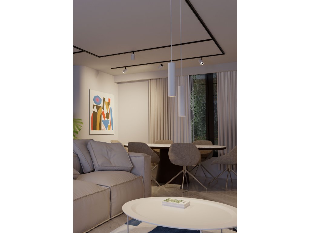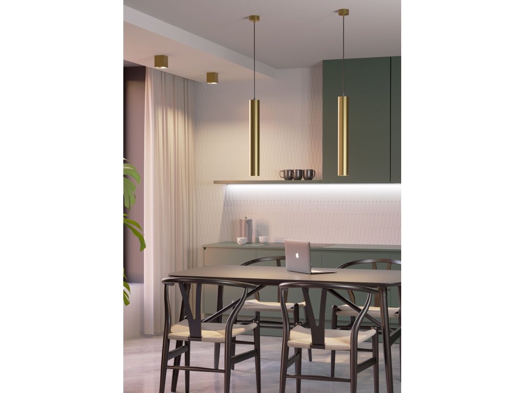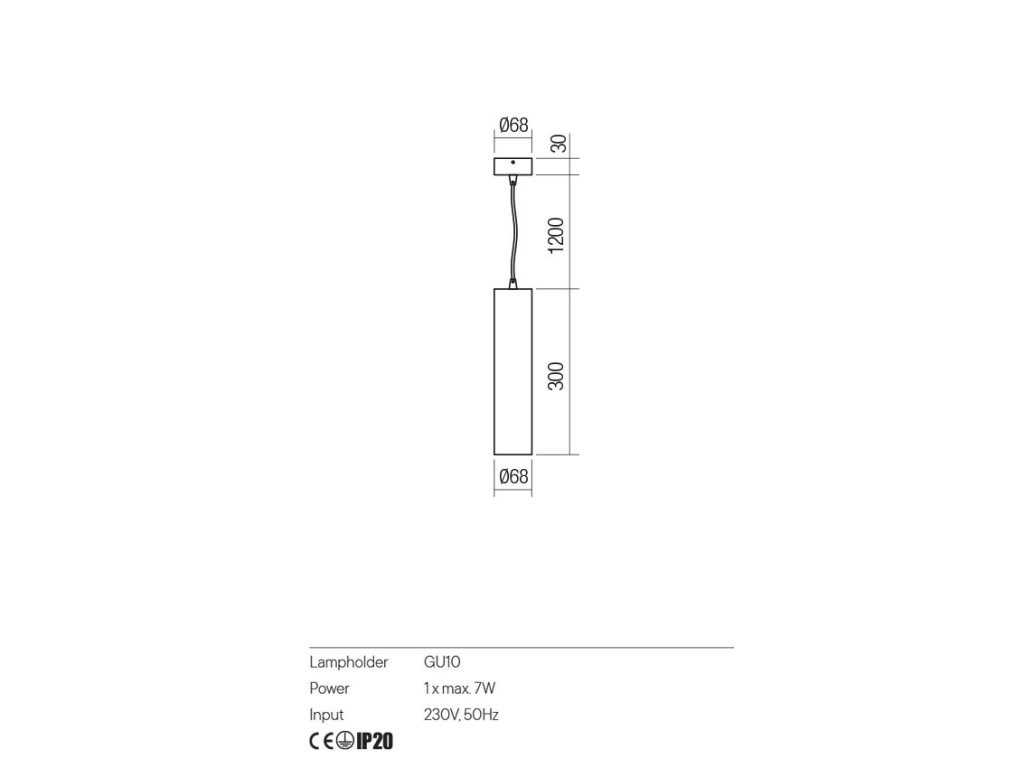 Závesné svietidlo do interiéru, konštrukcia z kovu a lisovaného hliníka, elektrostaticky lakované zvonku vo viacerých farebných variantoch a zvnútra matnou čiernou farbou. Zdroj GU10 nie je súčasťou balenia.