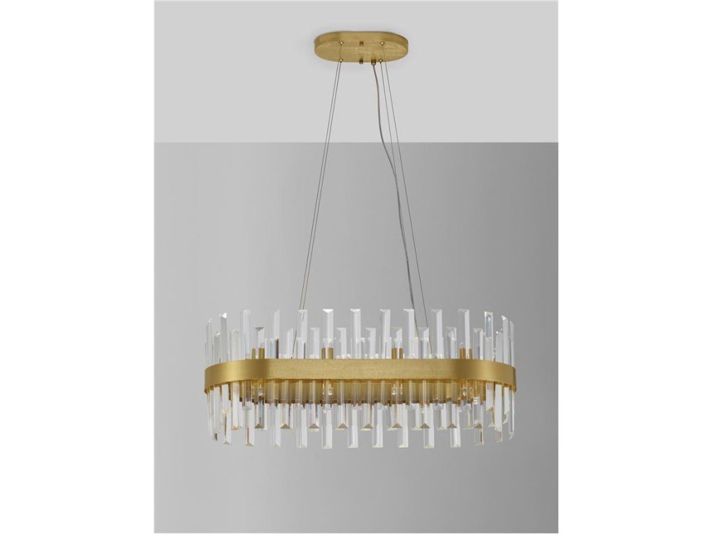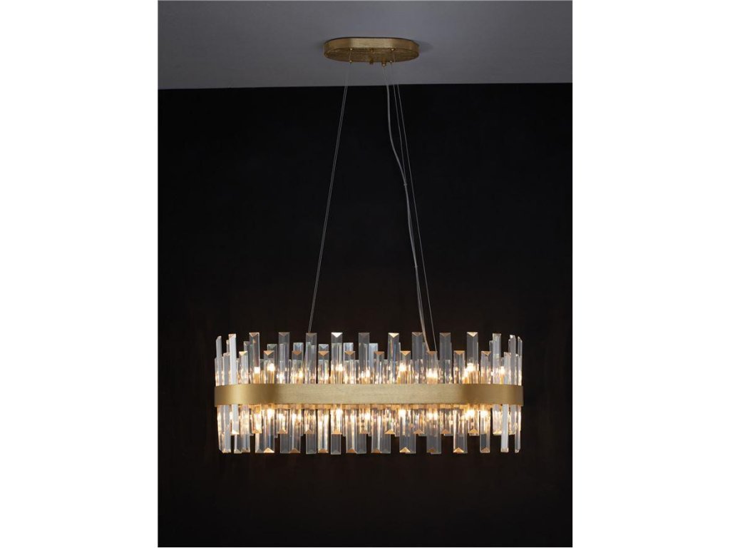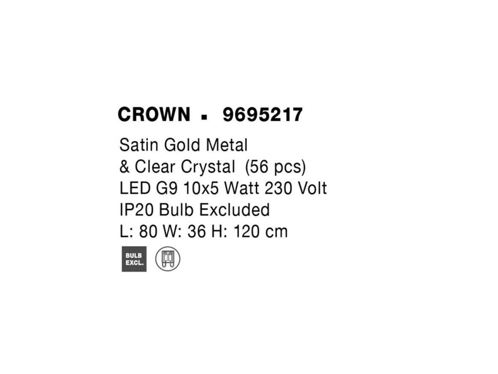 Závesné svietidlo CROWN je k dispozícii v zlatej farbe. Svietidlo je vyrobené z kovu a krištáľu. Rozmery svietidla sú 80x120 cm. Svietidlo pre svoje luxusné krištáľové prevedenie odporúčame do luxusnejšie zariadených vnútorných priestorov, napr. do obývacej izby, spálne alebo nad jedálenský stôl. Žiarovky G9 nie sú súčasťou balenia.