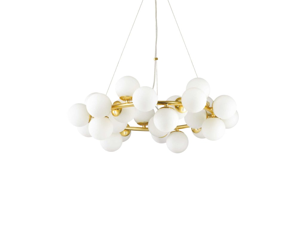 Originálny závesný luster DNA SP25 z kolekcie interiérového osvetlenia Ideal Lux vytvorí výrazný dekoratívny prvok v modernom aj klasickom interiéri. Efektne rozsvietia haly, obývacie priestory a jedálne. Na výrobu stropnej základne s priemerom 15 cm a kruhového rámu bol použitý kov so zlatou povrchovou úpravou. Ako vznášajúce sa bubliny vyzerajú tienidlá z bieleho fúkaného skla, ktoré sú rozmiestnené okolo rámu s priemerom 70,5 cm. Každé tienidlo je osadené päticou G9 pre žiarovky s maximálnym príkonom 25 x 40 W. Úsporné LED svetelné zdroje s príkonom 25 x 3,2 W a teplotou chromatickosti 3000K sú súčasťou balenia. Dĺžku zavesenia troch oceľových laniek je možné ľubovoľne nastaviť pri inštalácii podľa potreby od 37,5 cm do 126 cm. Krytie IP20 je vhodné na použitie do interiéru.Dodatočné parametre