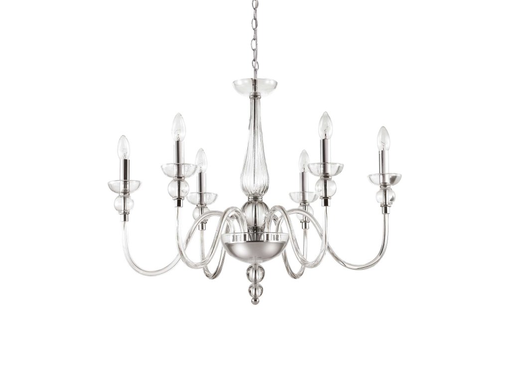 Závesný luster DOGE značky Ideal Lux v klasickom prevedení s priemerom 75 cm ponúkne ideálne osvetlenie obývacej izby, spálne či kuchyne. Rám svetla je vyrobený z kvalitného kovu s chrómovou povrchovou úpravou. Luster je zhotovený z ručne tvarovaného fúkaného skla v čírej farbe. Súčasťou šiestich ramien sú pätice E14 pre žiarovky s maximálnym príkonom 6 x 40 W. Zdroje nie sú súčasťou balenia. Odporúčame zvoliť LED sviečkové žiarovky, ktoré zdôraznia vzhľad svietidla a zároveň šetria elektrickú energiu. Svietidlo je ručne zdobené lesklými chrómovými detailmi. Výšku zavesenia lustra je možné flexibilne nastaviť podľa potreby pri inštalácii svietidla od 70 cm do 150 cm. Krytie IP20 je vhodné na použitie do interiéru. Celkové rozmery svietidla sú 150 x 75 x 75 cm. Je určené na napájanie zo siete na 220-240 V a vzťahuje sa naň predĺžená záruka 5 rokov.Dodatočné parametre