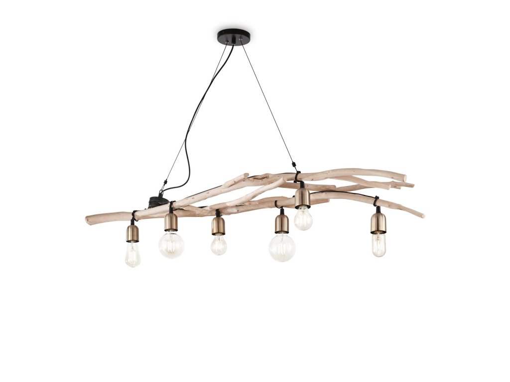 Masívny netradičný luster Driftwood SP6 s prírodnými opracovanými drevenými dekoratívnymi ramenami v dĺžke 140 cm so šiestimi objímkami s päticami E27 pre žiarovky s maximálnym príkonom 6 x 60 W, ktoré nie sú súčasťou balenia. Na dokreslenie rustikálneho štýlu a úsporu energie odporúčame použiť úsporné LED Vintage žiarovky. Dĺžka zavesenia je nastaviteľná pri inštalácii od 37 cm do 123 cm.Dodatočné parametre
