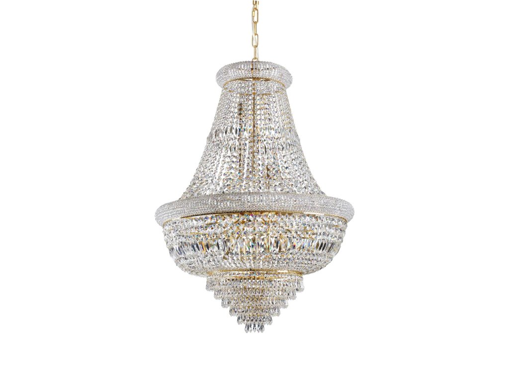Elegantný závesný luster Dubai SP24 z kolekcie interiérového osvetlenia Ideal Lux v najväčšom prevedení s priemerom 80 cm vhodne doladí každý interiér v modernom aj klasickom štýle. Ideálne rozsvietia haly, obývacie priestory alebo hotelové interiéry. Svietidlo tvorí kovový rám s lesklou zlatou povrchovou úpravou, ktorý je dookola ozdobený dekoratívnymi prvkami z brúseného číreho krištáľu v tvare osemuholníkov a hranolov. Štýlové svietidlo je osadené päticami E14 s maximálnym príkonom 24 x 40 W. Žiarovky nie sú súčasťou balenia. Odporúčame použiť úsporné LED svetelné zdroje s dlhou životnosťou. Dodávateľ odporúča zvoliť LED filamentové žiarovky s príkonom 4W a teplotou chromatičnosti 3000K (neutrálne biele svetlo). Dĺžku zavesenia reťaze je možné flexibilne nastaviť pri inštalácii podľa potreby od 120 cm do 225 cm dĺžky. Krytie IP20 je vhodné na použitie do interiéru.Dodatočné parametre