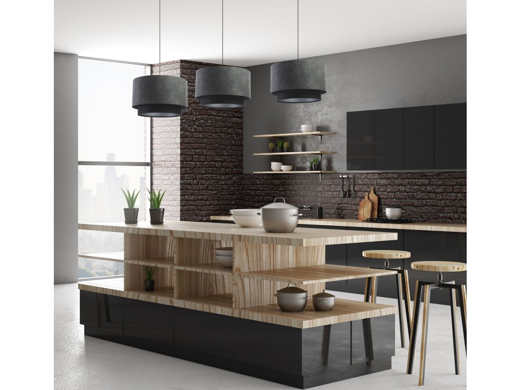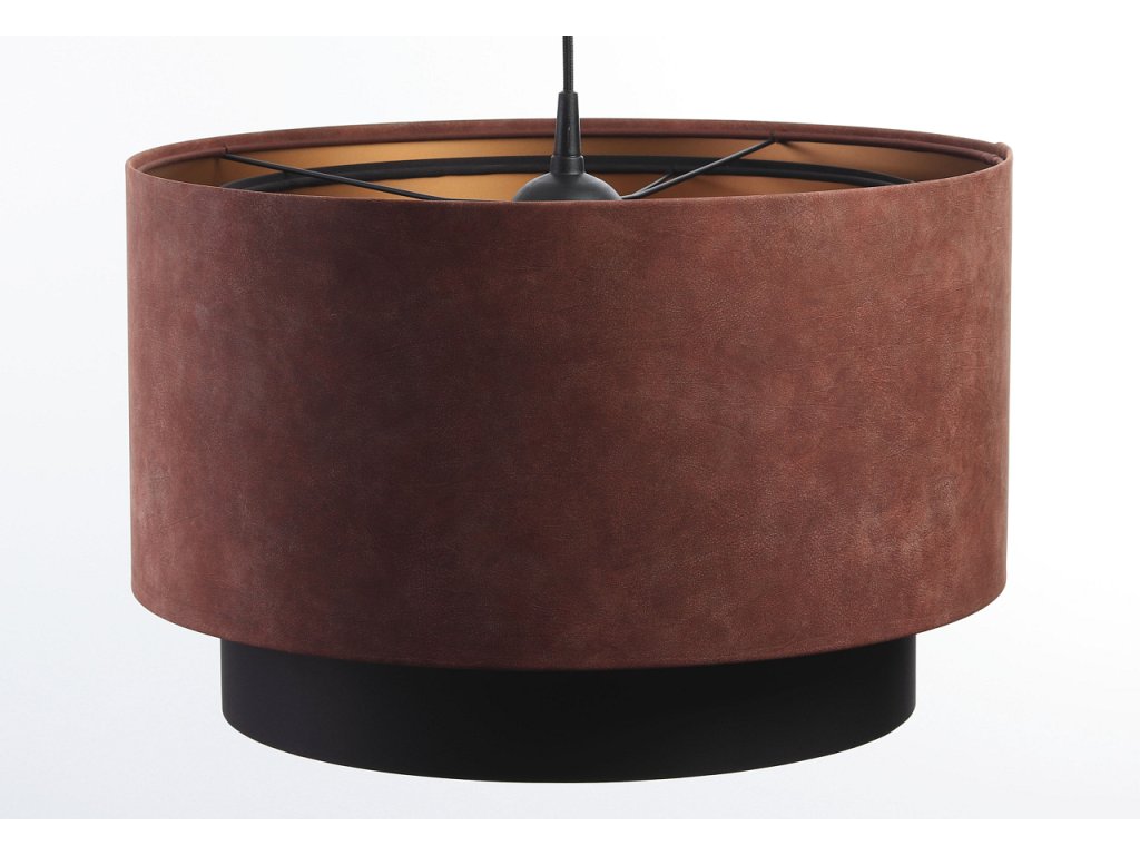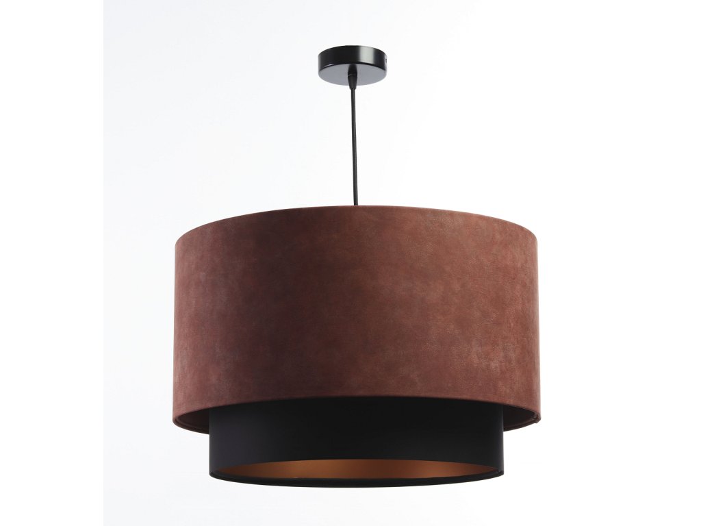 Závesné svietidlo DUO v čiernej farbe v kombinácii s tromi farebnými variantmi - šedá, hnedá a hrdzavá. Tienidlo je odolné voči UV žiareniu, takže tkanina počas používania nevybledne. Priemer svietidla je 50 cm. Skvele sa hodí do obývacej izby či spálne.