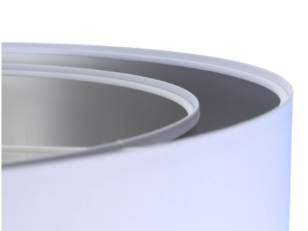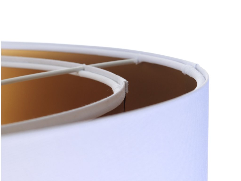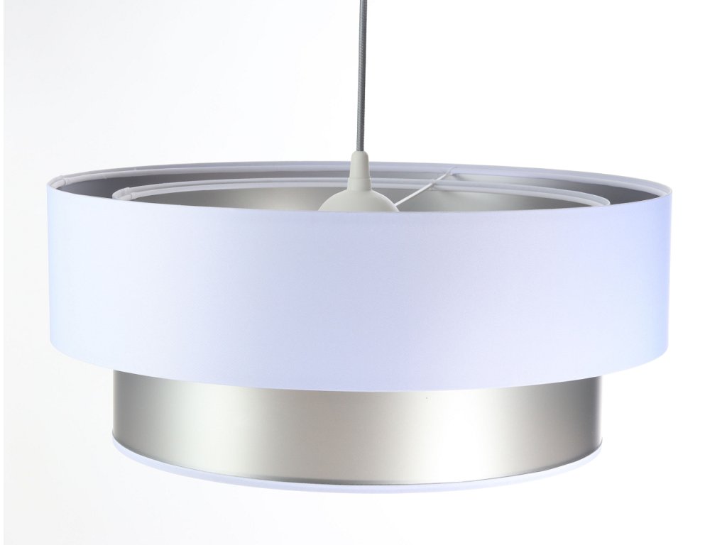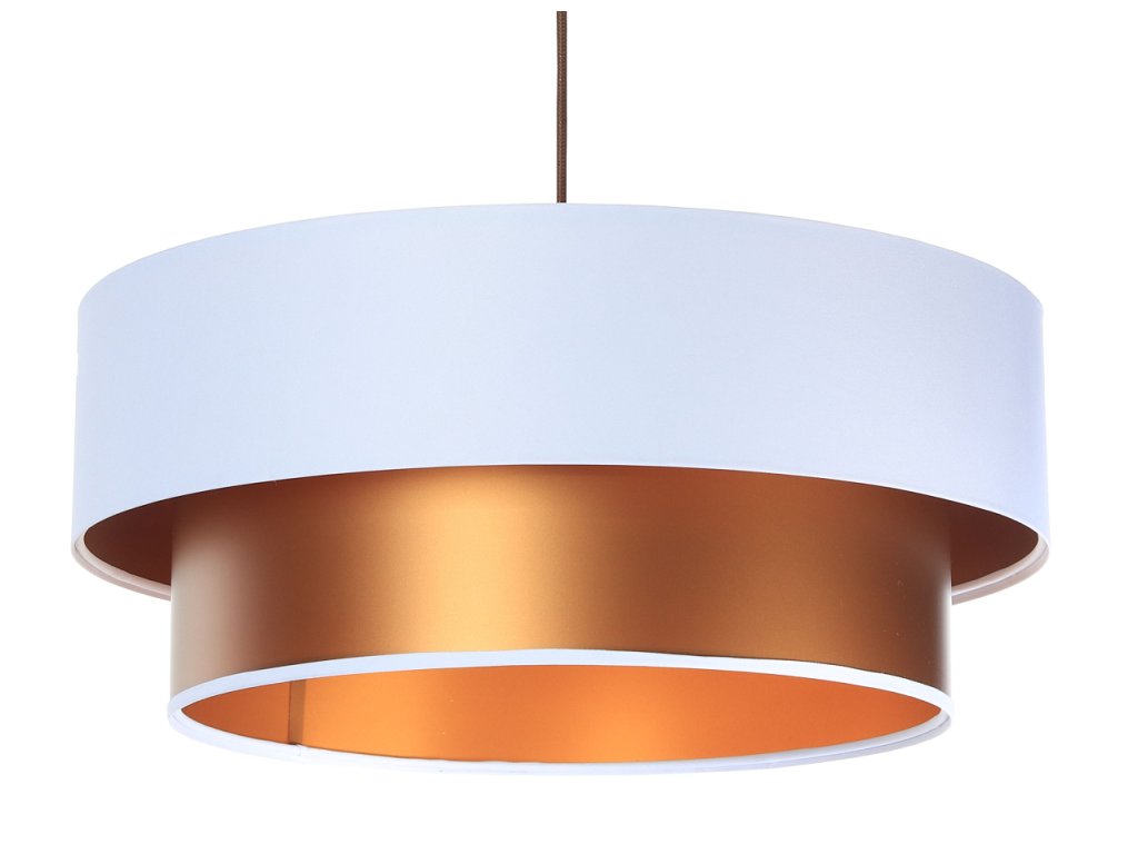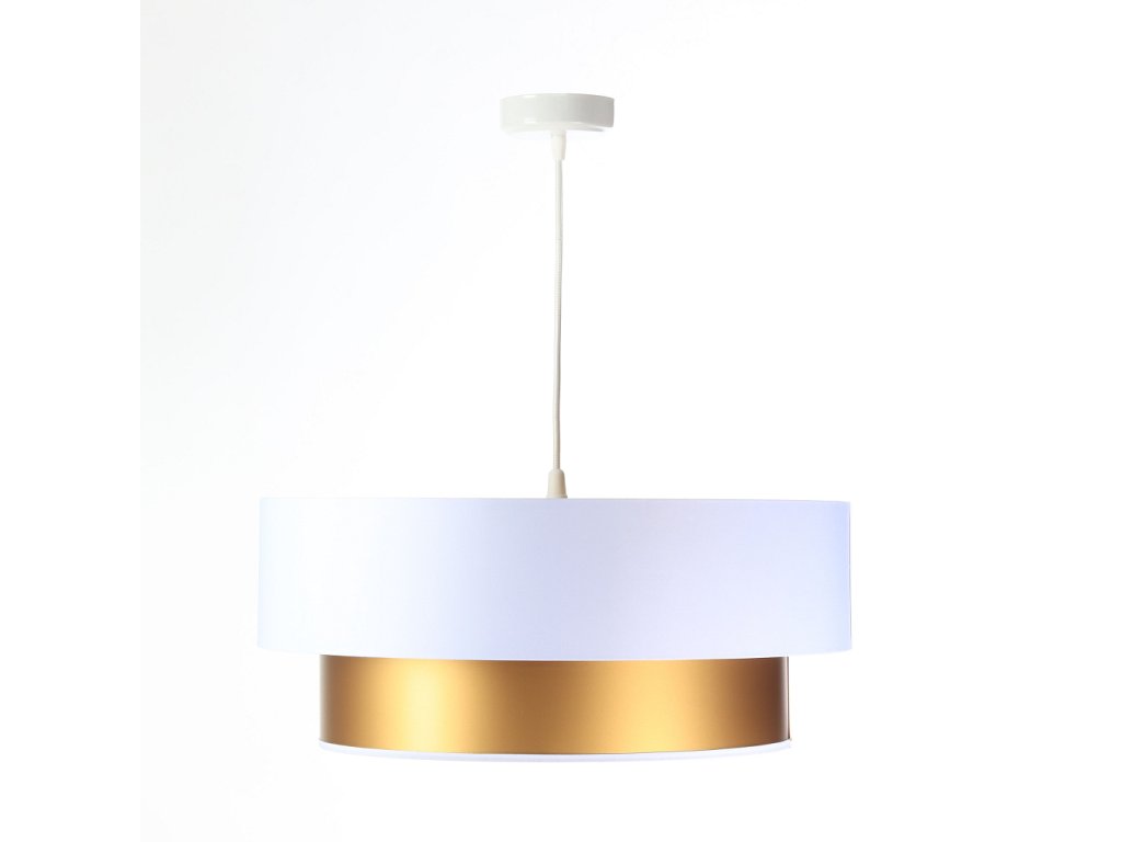 Závesné svietidlo DUO v bielej farbe v kombinácii s tromi farebnými variantmi - zlatá, strieborná a medená. Tienidlo je odolné voči UV žiareniu, takže tkanina počas používania nevybledne. Priemer svietidla je 60 cm. Skvele sa hodí do obývacej izby či spálne.