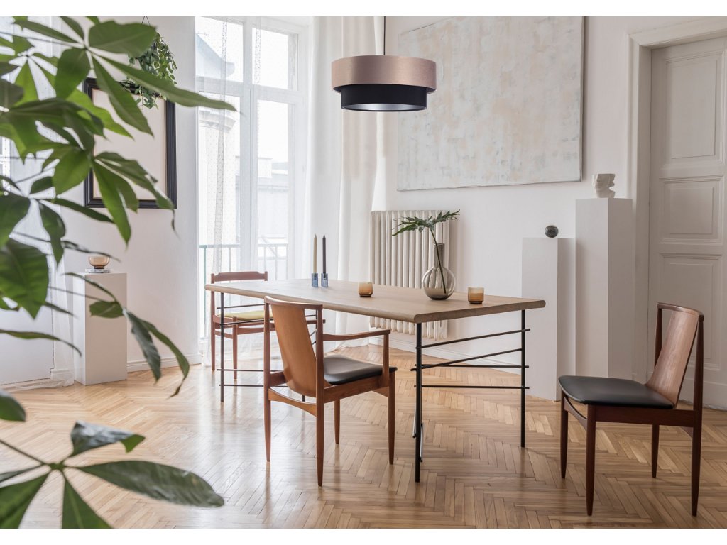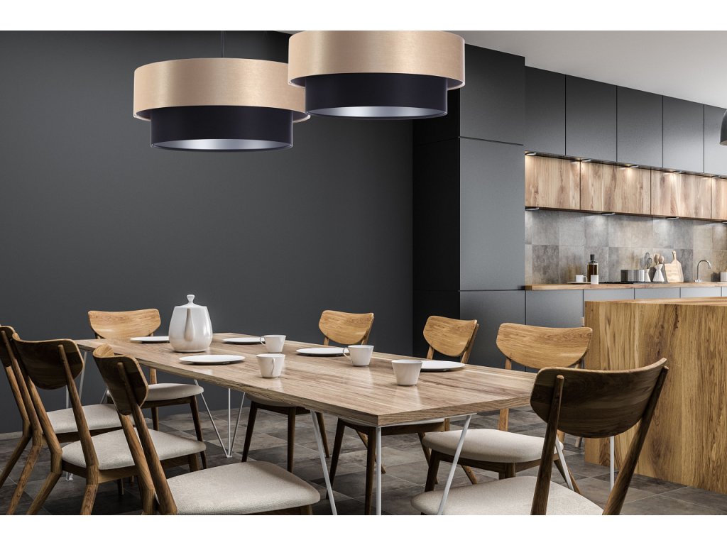 Závesné svietidlo DUO v čiernej farbe v kombinácii s tromi farebnými variantmi - šedá, béžová a krémová. Tienidlo je odolné voči UV žiareniu, takže tkanina počas používania nevybledne. Priemer svietidla je 40 cm. Skvele sa hodí do obývacej izby či spálne.
