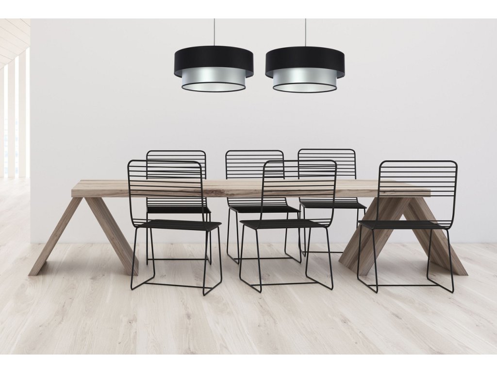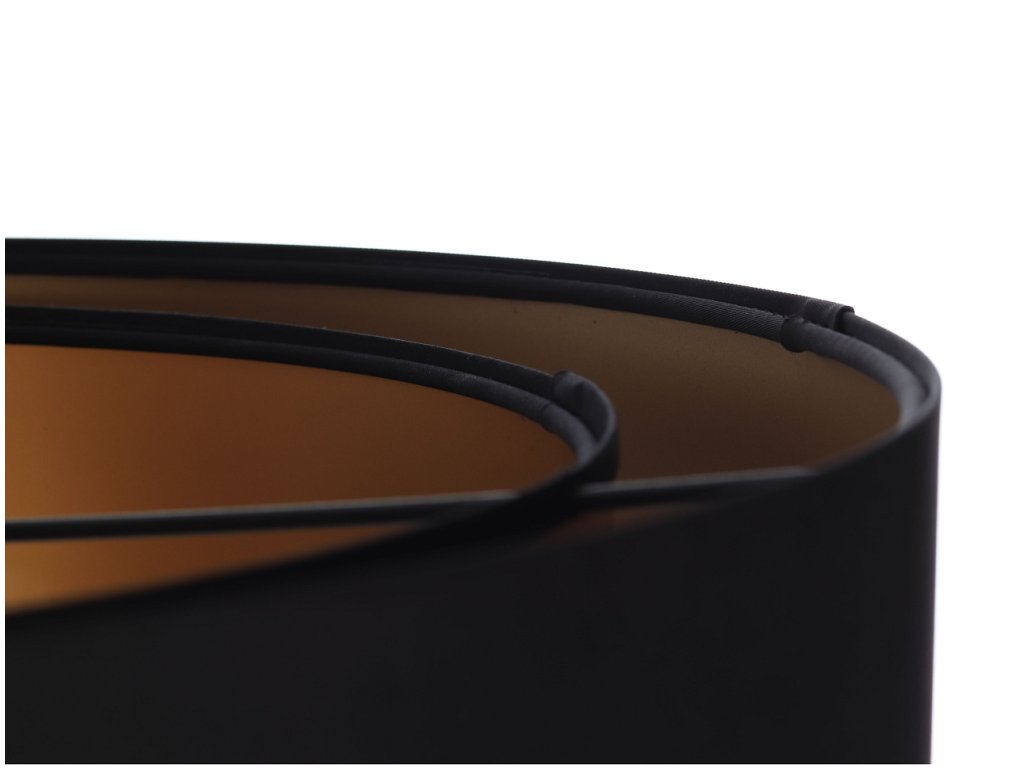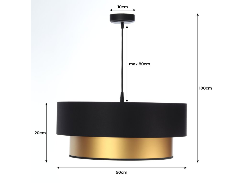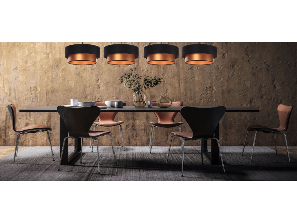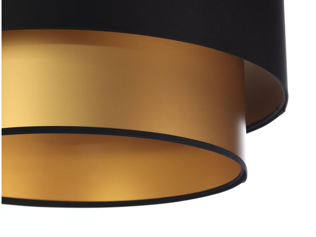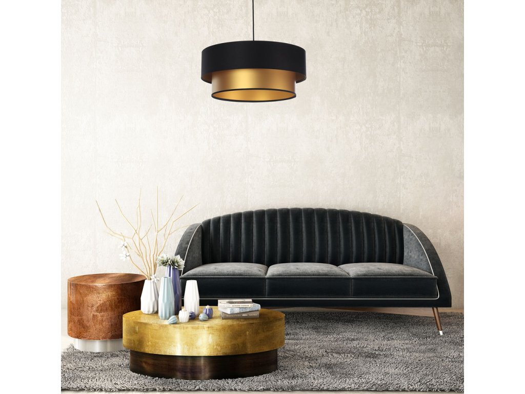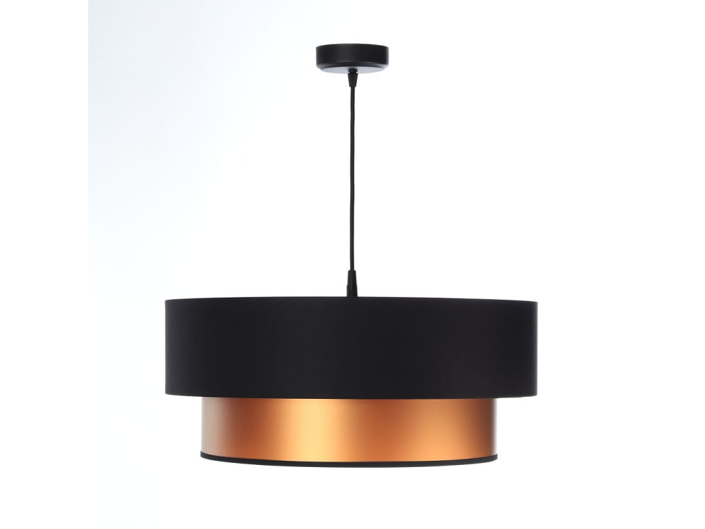 Závesné svietidlo DUO v čiernej farbe v kombinácii s tromi farebnými variantmi - zlatá, medená a strieborná. Tienidlo je odolné voči UV žiareniu, takže tkanina počas používania nevybledne. Priemer svietidla je 50 cm. Skvele sa hodí do obývacej izby či spálne.